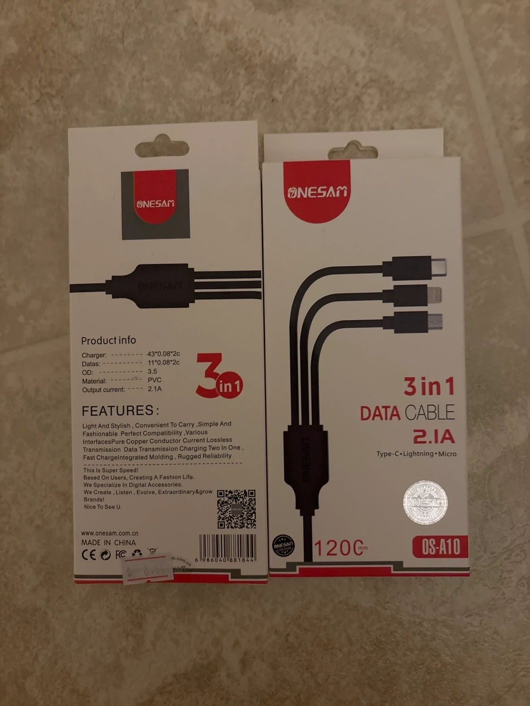 Selling a brand new ONESAM 3 in 1 data cable! It supports Type-C, Lightning, and Micro connections. Features: - Light and stylish - Convenient to carry - Perfect compatibility - Pure copper conductor for lossless transmission - Fast charge integrated molding - Rugged reliability Comes in the original box!