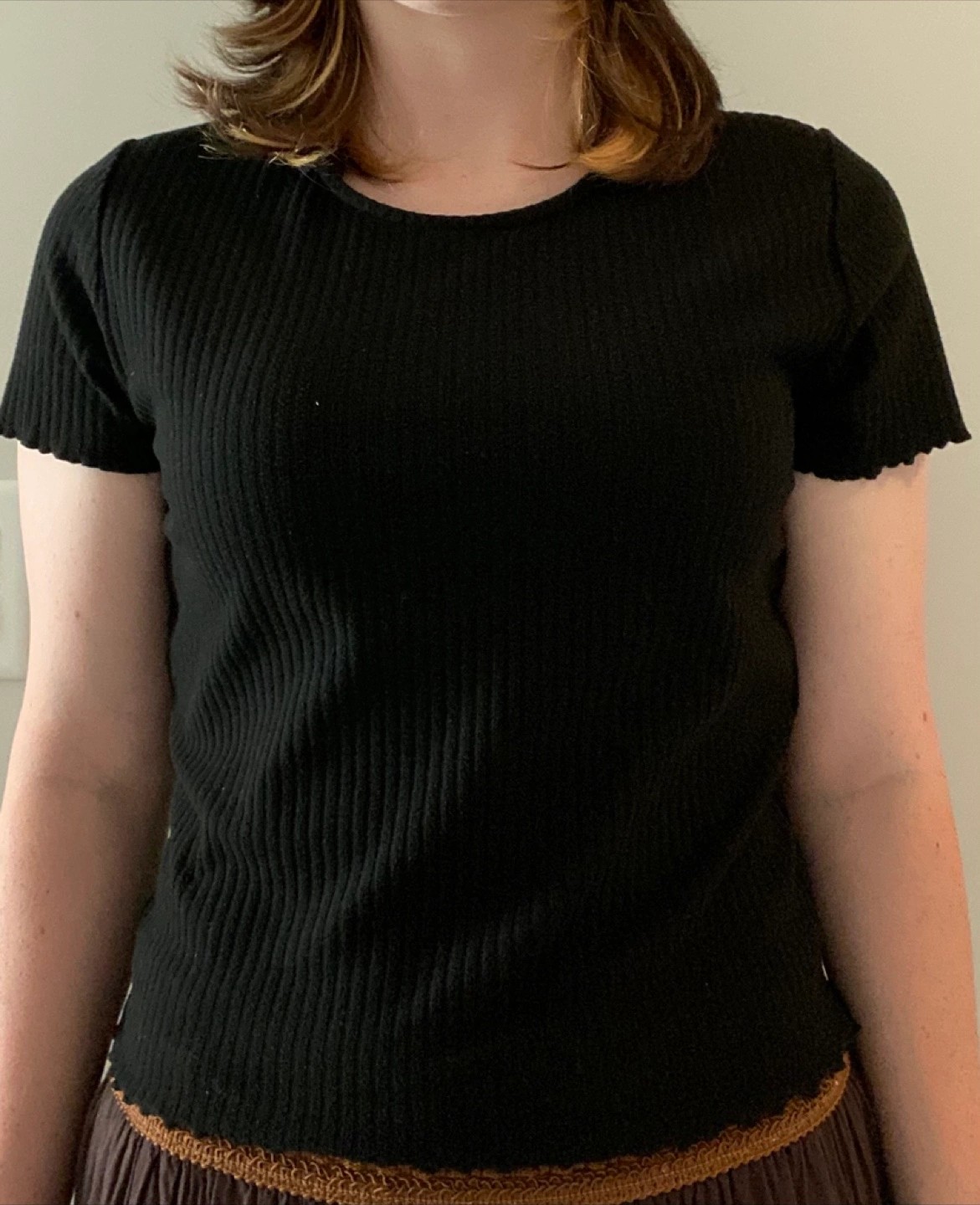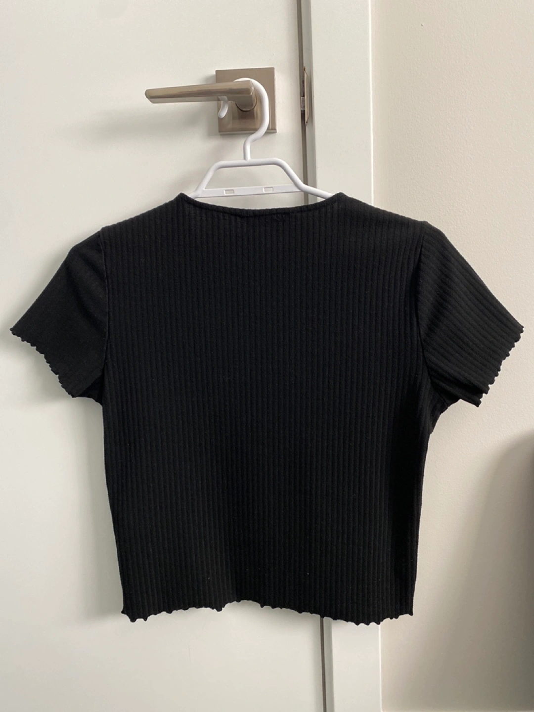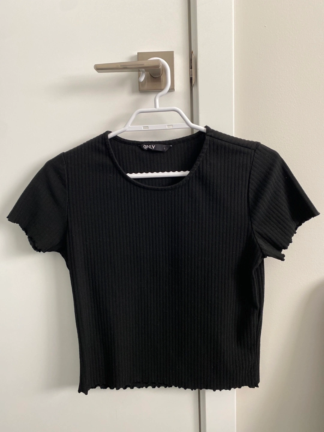 Selling a cute black ribbed crop top from Only. It's a size large and in great condition! Perfect for layering or wearing on its own. Great shirt, just selling because I’m not a fan of the baby sleeves.