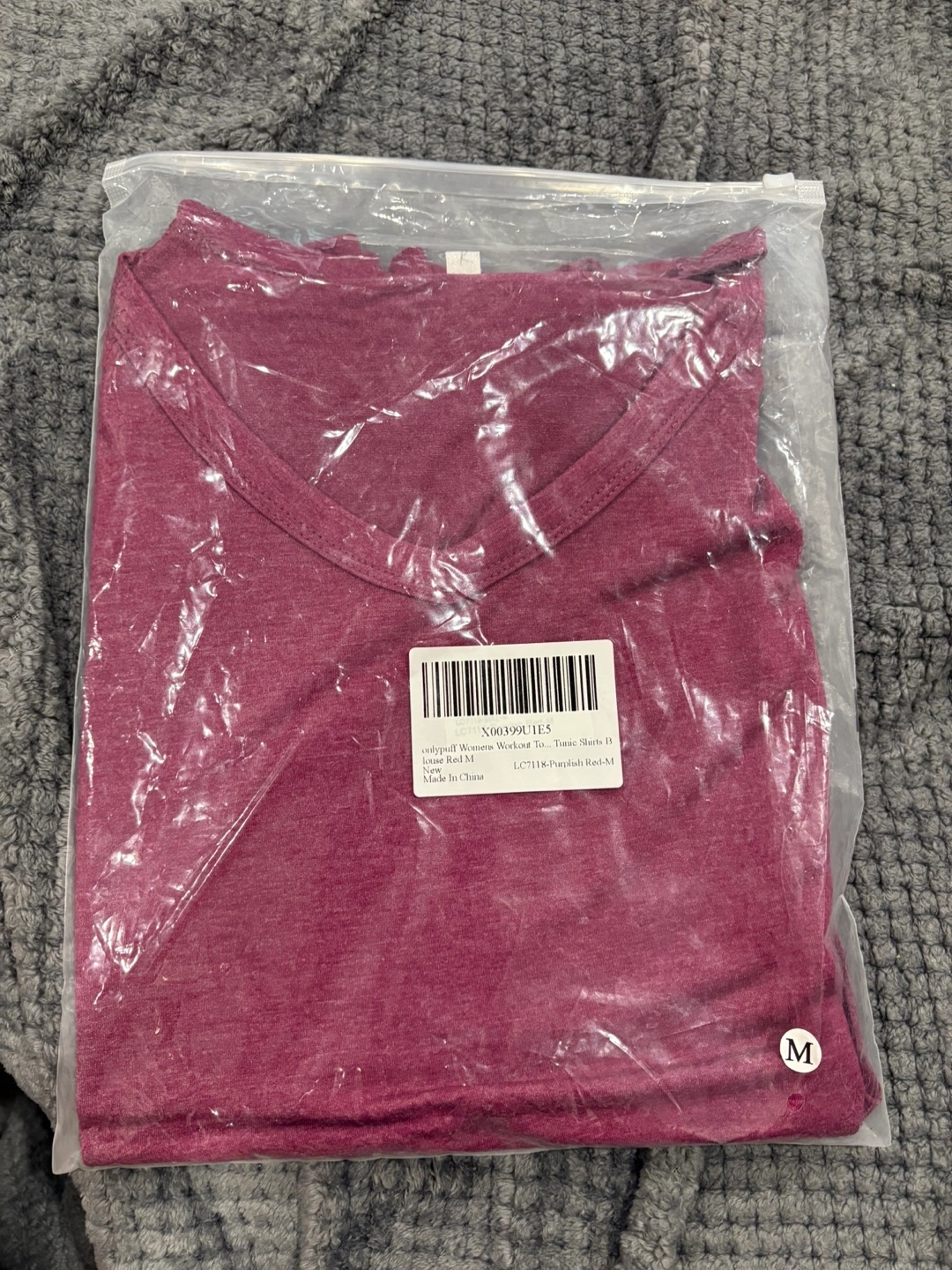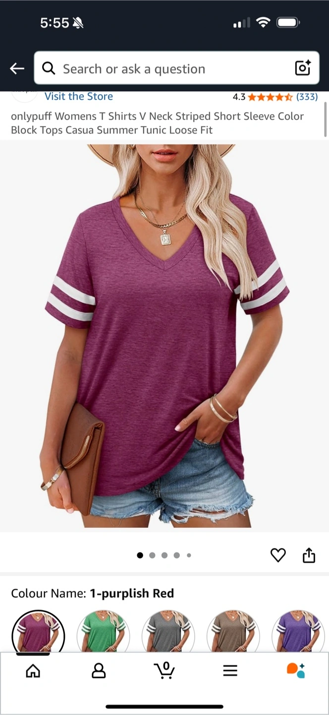 Selling a brand new Onlypuff women's T-shirt in size M. It's a stylish V-neck tunic with short sleeves and a sporty striped design. The colour is a lovely purplish red! It's still in its original packaging.