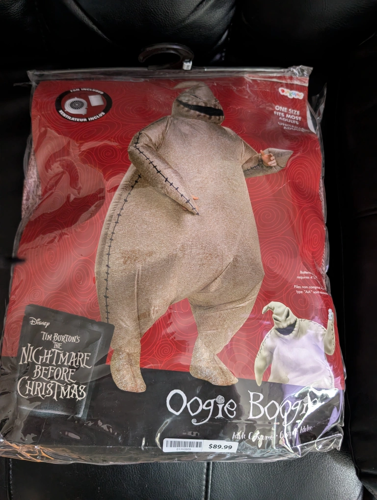 Get ready for Halloween with this brand new, never-worn Oogie Boogie inflatable costume from Disney's The Nightmare Before Christmas! This one-size-fits-most adult costume includes a fan for inflation. Originally bought for $89.99, it's ready for a new home and some spooky fun!