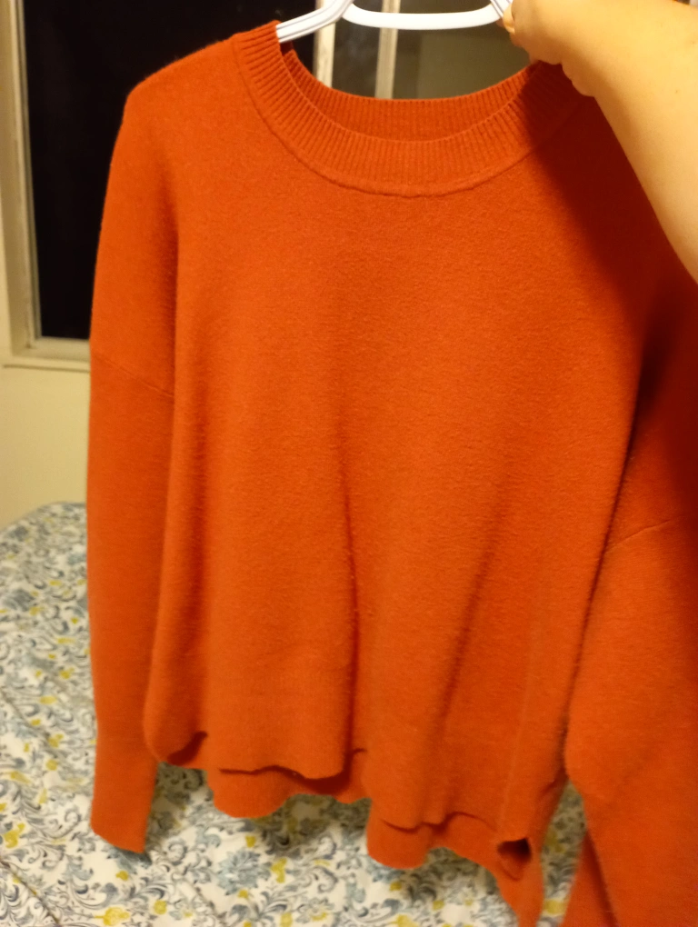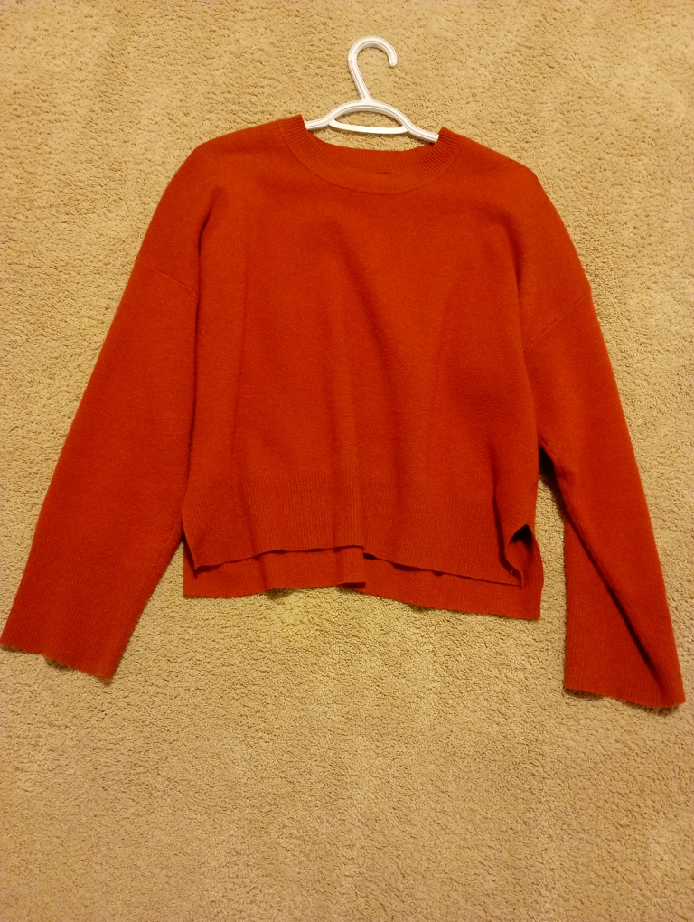 A cozy orange knit sweater, perfect for layering or wearing on its own! It's in great shape and ready for a new home. The material is soft and comfortable, making it ideal for everyday wear