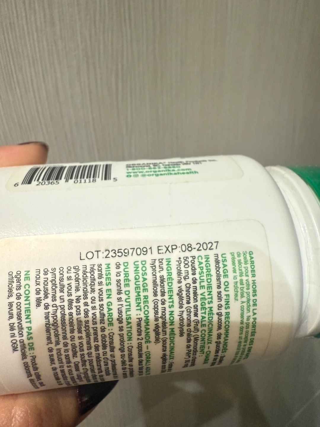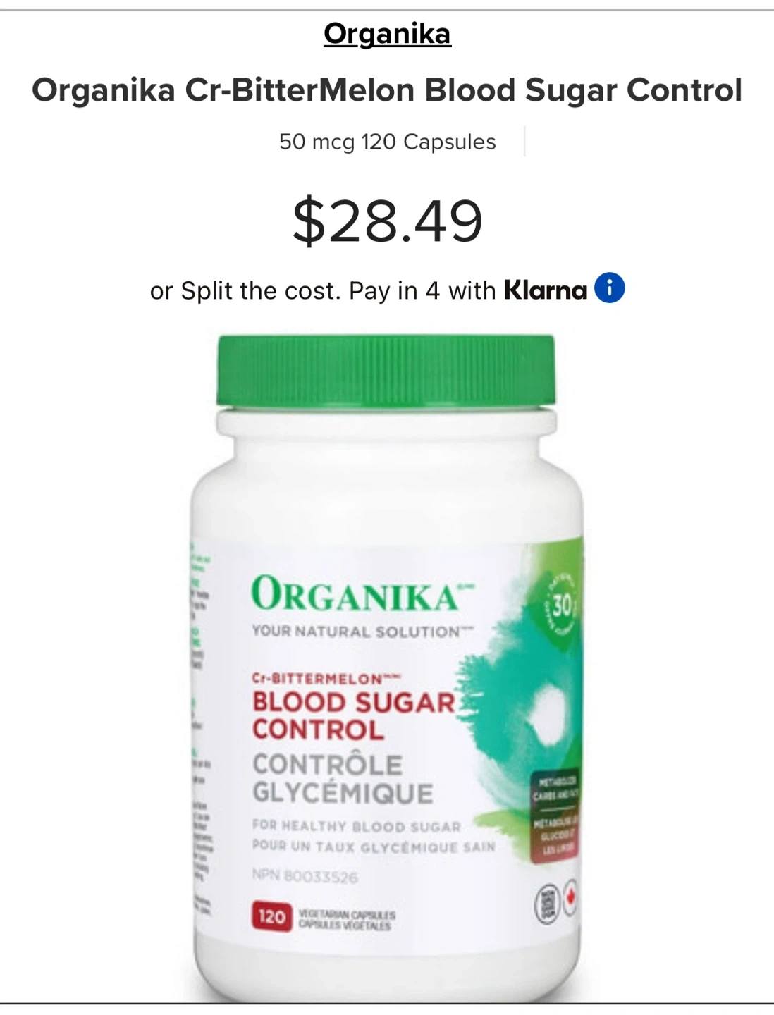I'm selling a bottle of Organika Cr-Bittermelon Blood Sugar Control capsules. It contains 120 capsules. Expiration date: 2027 August 08 Currently retailing for $28
