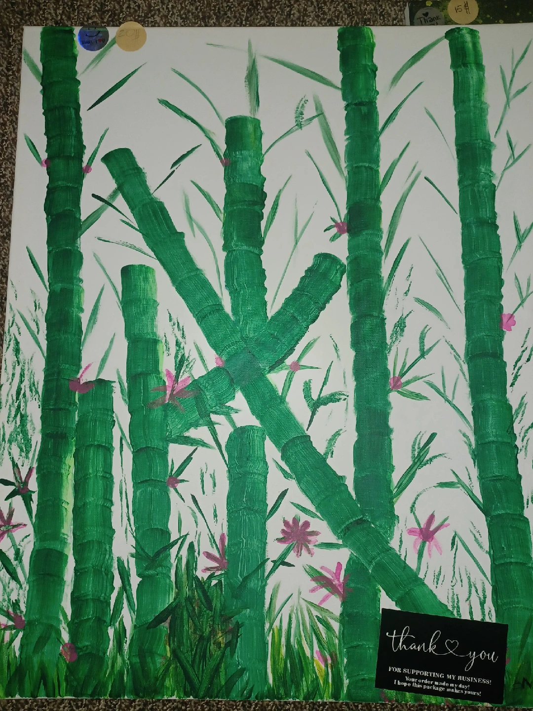Here's a unique bamboo painting! The colours are vibrant and would look great in any room. It features green bamboo stalks against a white background, with some lovely pink flowers scattered throughout