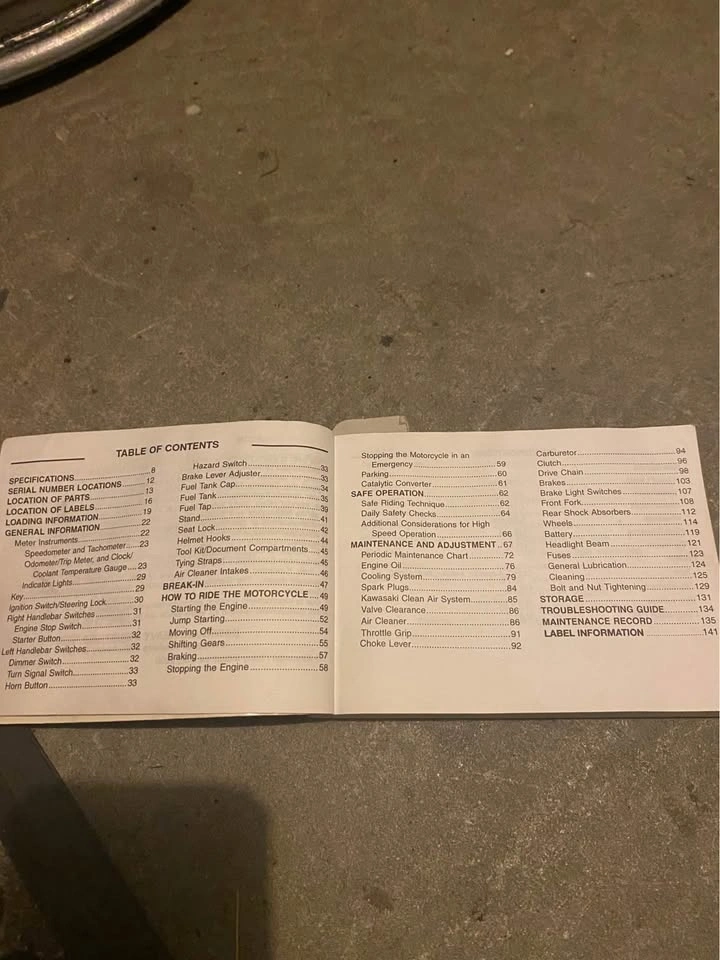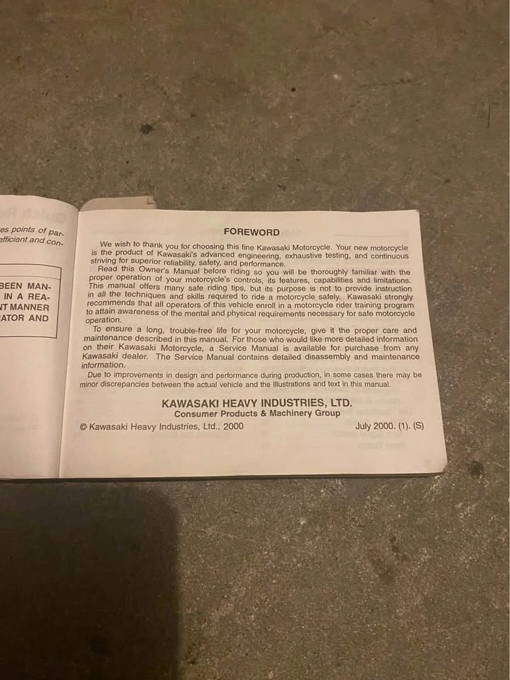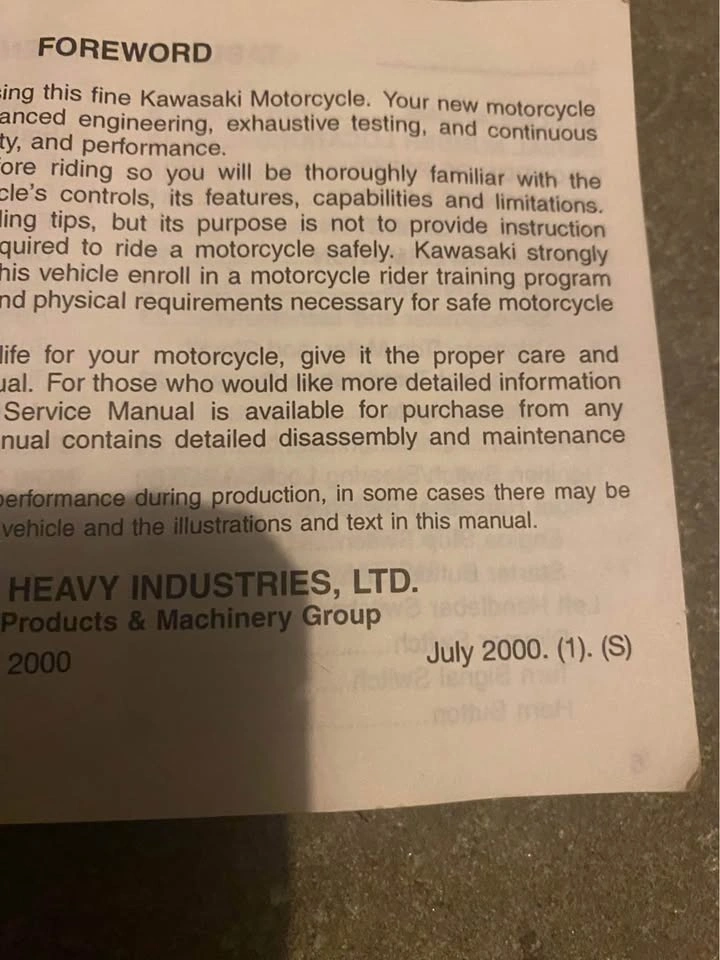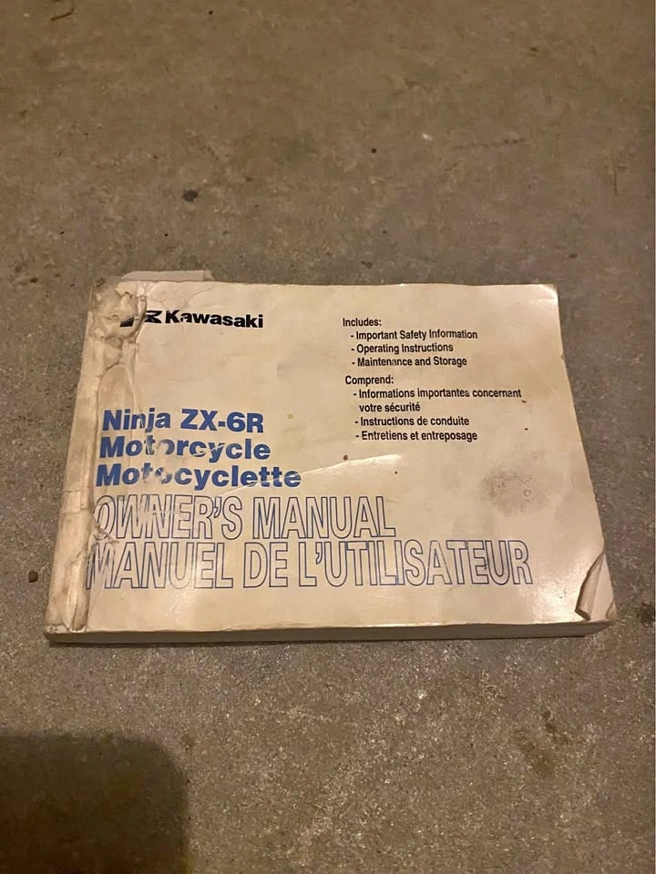 Used but good condition. It’s for the year 2000 Kawasaki zx6r. No missing pages just the front one ripped.