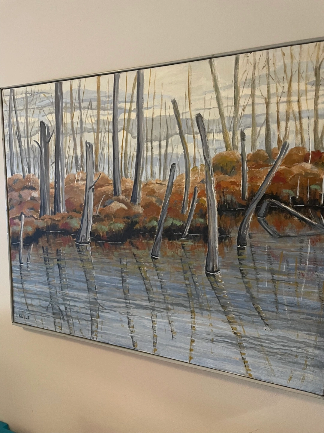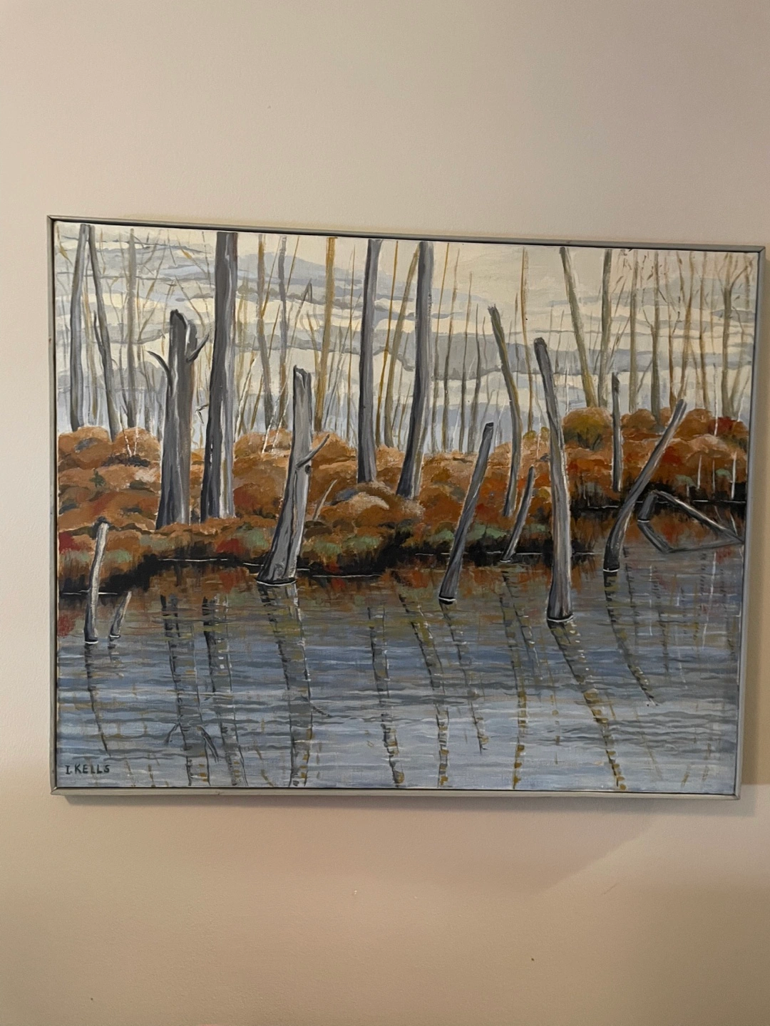 Framed landscape painting. Depicts a tranquil scene with bare trees reflected in still water. Muted earth tones. Artist signature visible in bottom left corner. This stunning piece of art was created by Dauphin, Manitoba artist Irene Kells . It is a depiction of Whirlpool Lake at Riding Mountain National Park . Called After the Fire . In reference to the forest fire of 1980 the ravaged the Whirlpool lake area . Painted with oil. Kells at the time was the owner of what was known as the “Manitouweeban” located in Tawapit Drive . It measures 30” x 24” and is a one of a kind. It can be viewed in my well lit comfortable and warm building lobby . Accepting Etransfer, cash, or square reader for debit and credit card transactions. If you have an acquaintance that may wish to hang a nostalgic image of Riding Mountain National Park, please share . Accepting cash , etransfer , credit cards or PayPal .