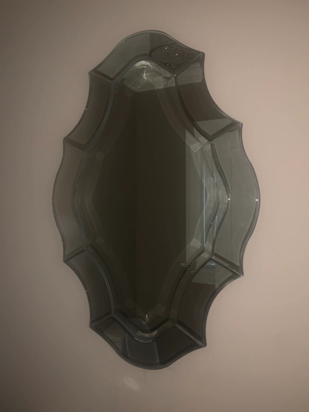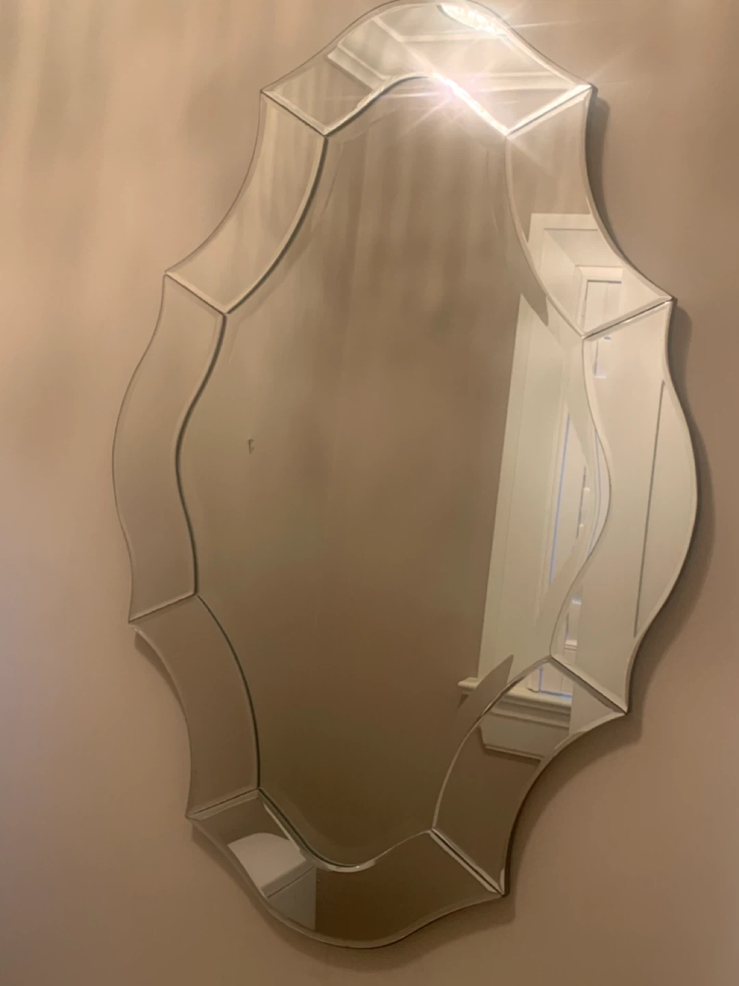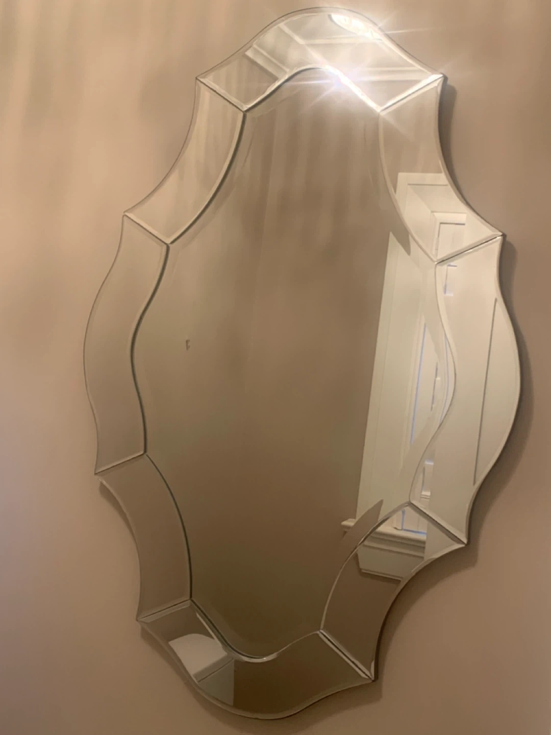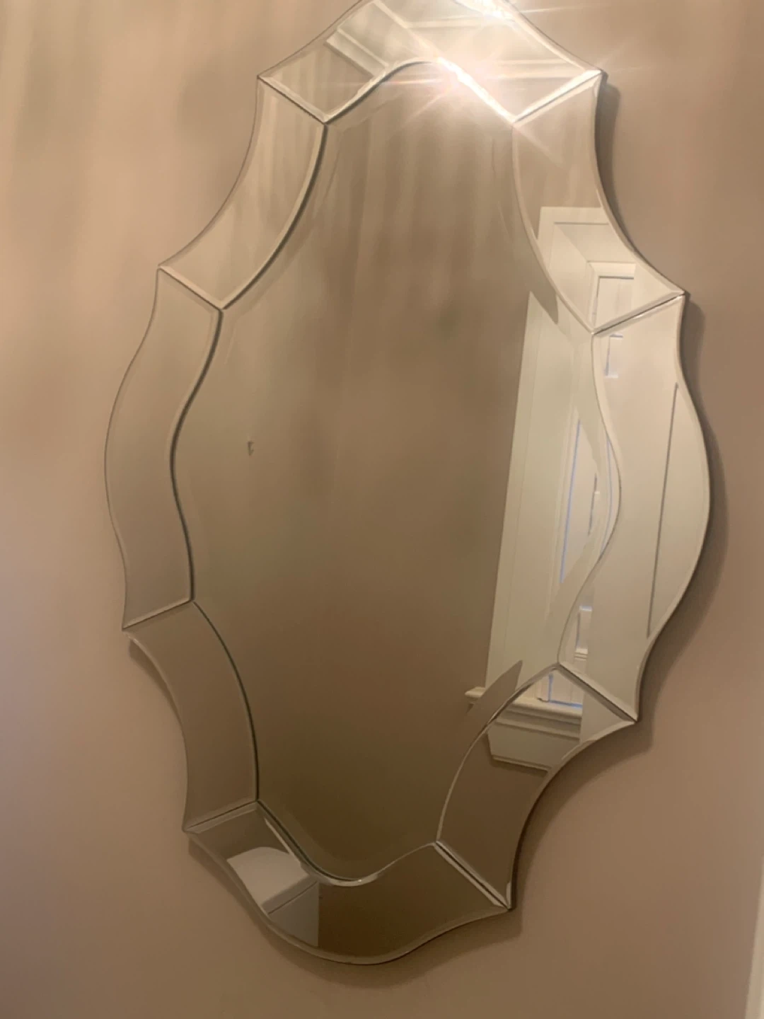 Selling a lovely bevelled wall mirror. It has an ornate shape and would look great in any room. It's in excellent condition and ready to find a new home!