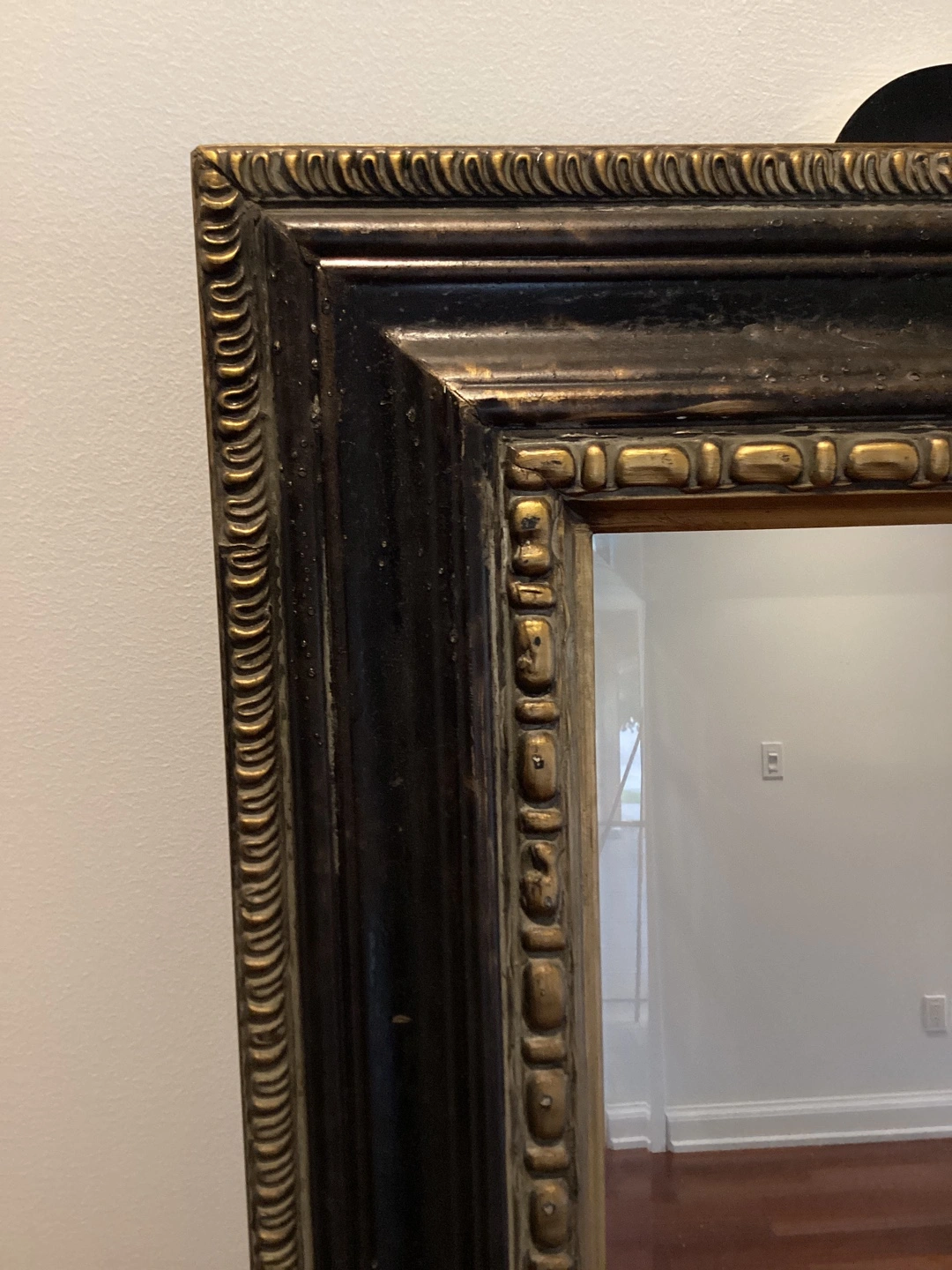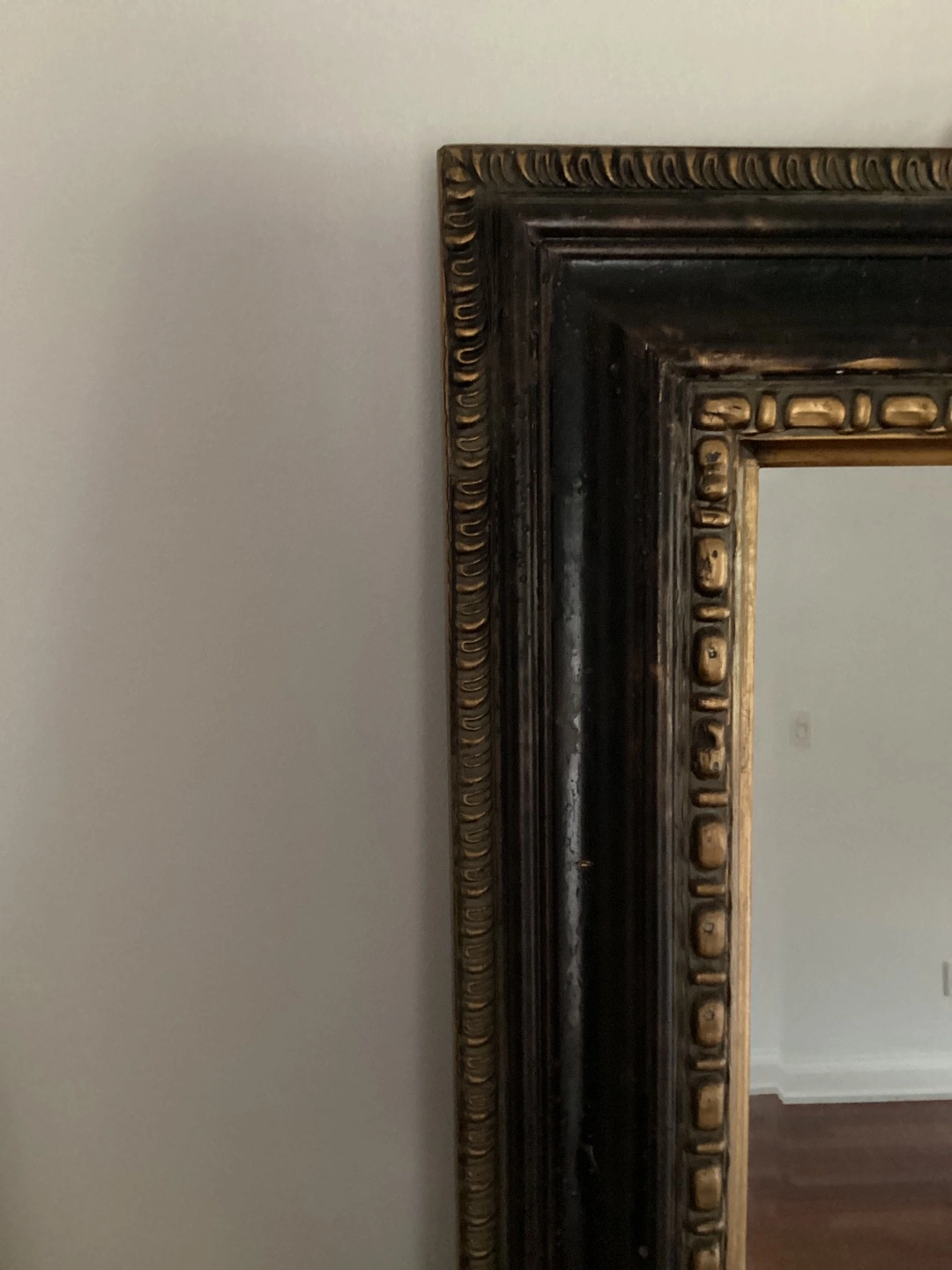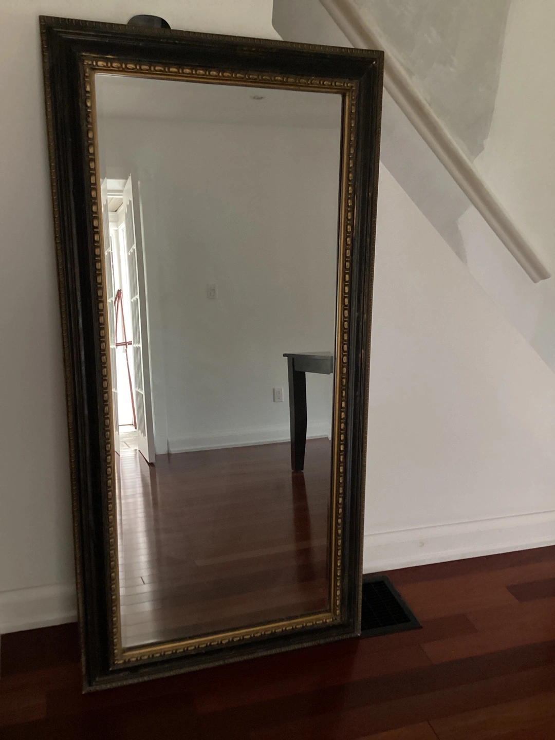 Selling a full-length mirror with a beautiful ornate frame! It has a black and gold finish. There is some minor damage to the frame, as shown in the photos, but it's still a stunning piece for any room