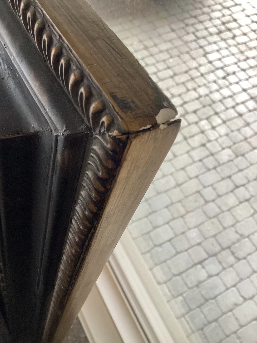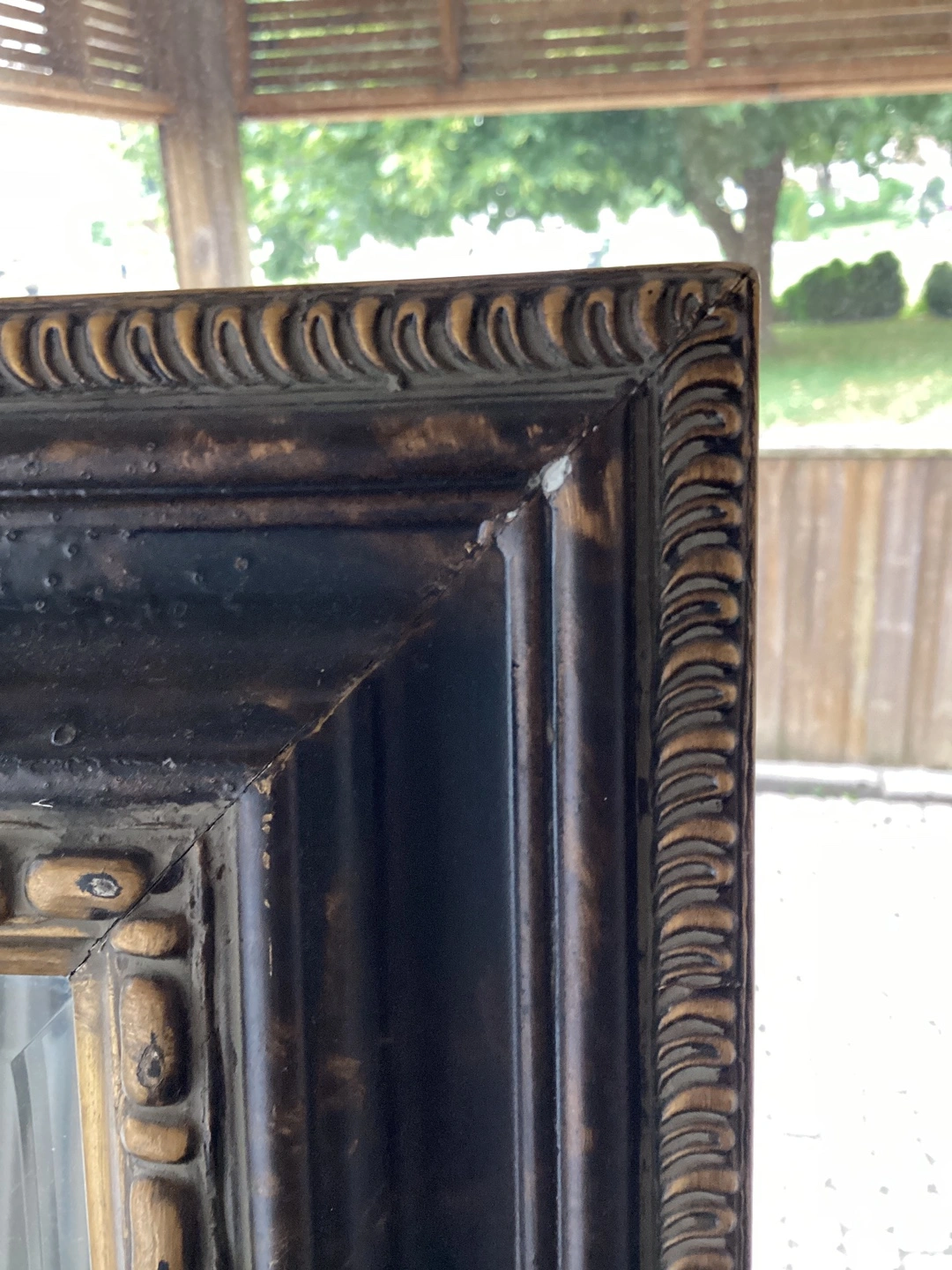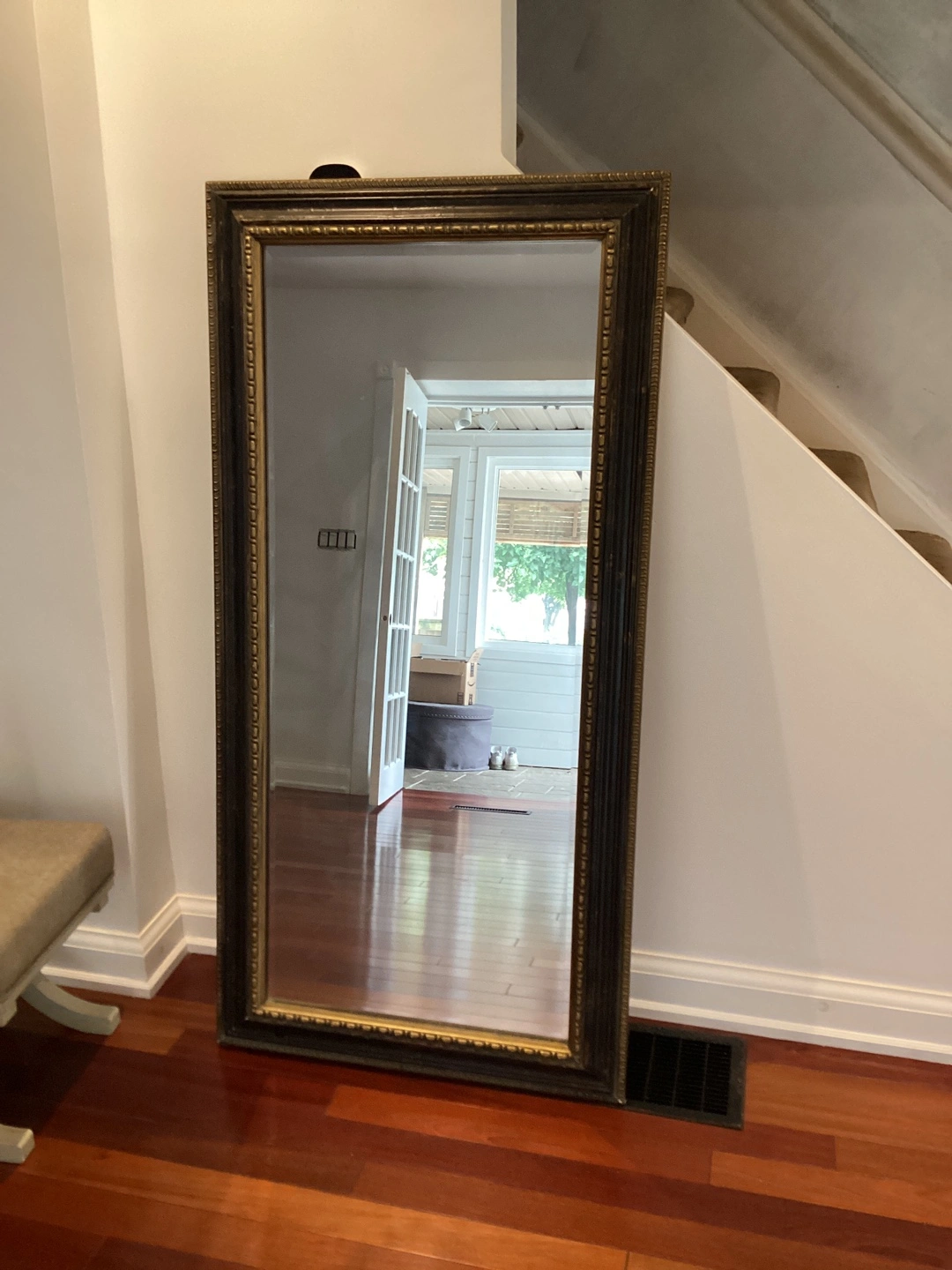 Selling a full-length mirror with a beautiful ornate frame! It has a black and gold finish. There is some minor damage to the frame, as shown in the photos, but it's still a stunning piece for any room