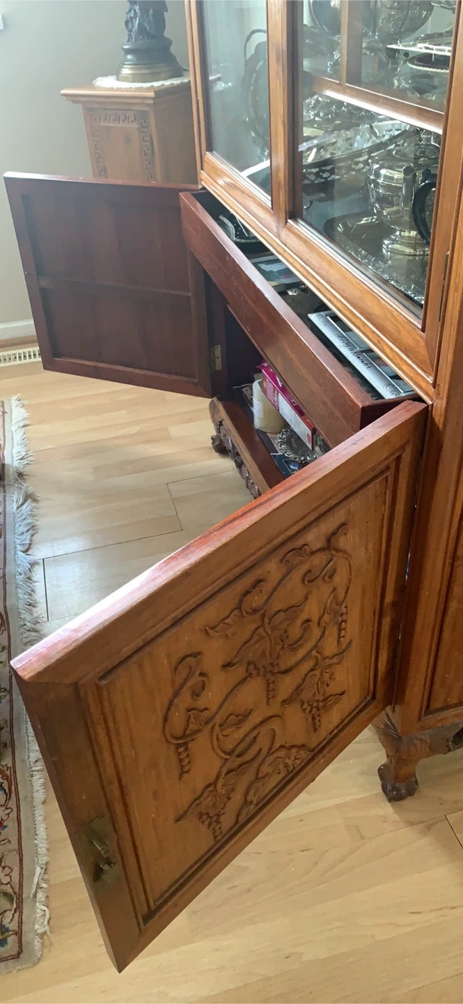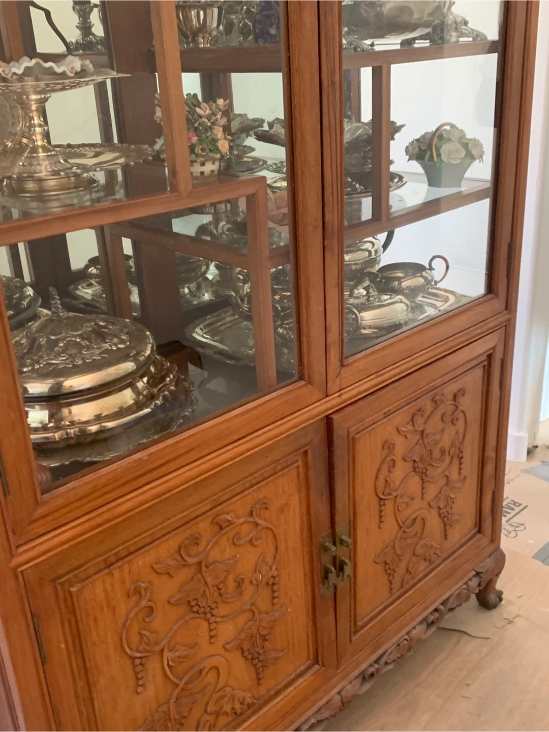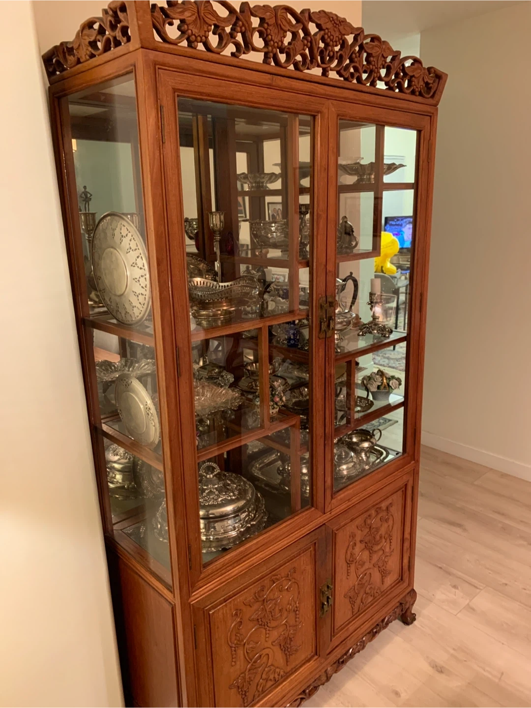 Selling a beautiful wooden display cabinet with ornate carvings. It's perfect for showcasing your favourite items and adding a touch of elegance to any room. The cabinet features glass doors and shelves, providing a clear view of the contents inside. It's in great condition and ready for a new home!