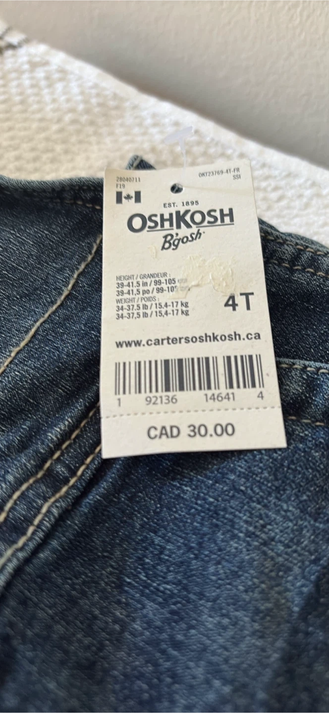 Here are a pair of OshKosh B'gosh denim overalls in size 4T! They're in great condition and 👶✨ OshKosh B’gosh Denim Overalls – Size 4T ✨👖 Adorable OshKosh B’gosh classic denim overalls in toddler size 4T. Perfect for play, photos, or everyday wear. Timeless style that’s durable and comfortable for little ones. ✔️ Authentic OshKosh B’gosh quality ✔️ Adjustable straps for the perfect fit ✔️ Classic vintage-inspired denim look 💲 10 📍 Pickup in Uxbridge A must-have wardrobe piece for toddlers — cute, practical, and built to last! ready for a new home. The tag shows they were originally CAD $30.00