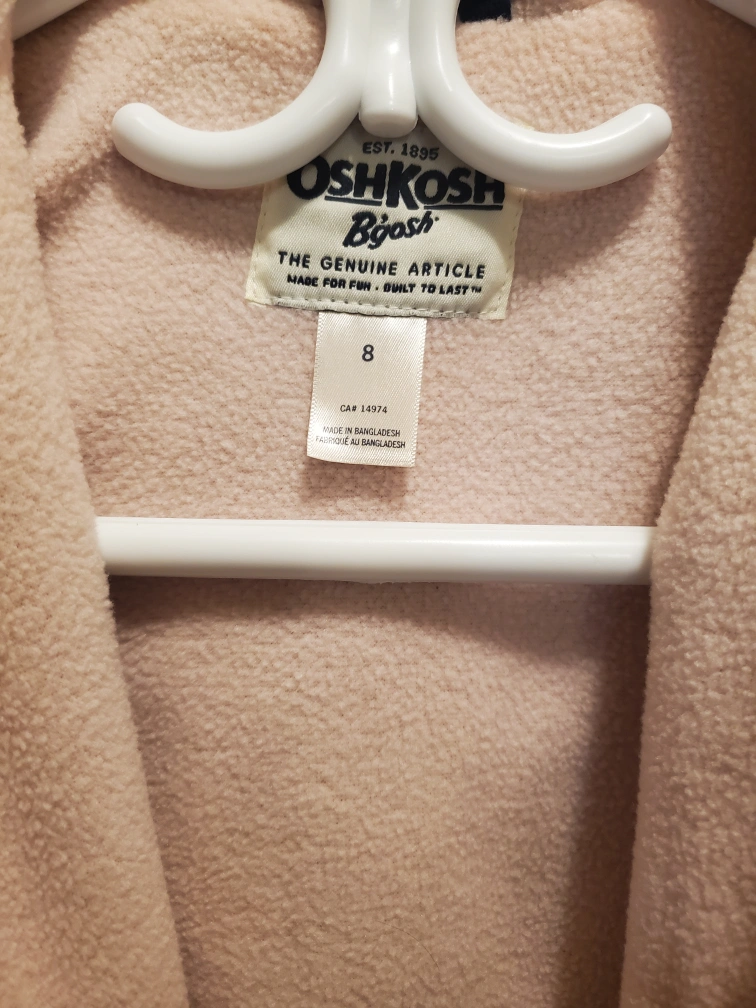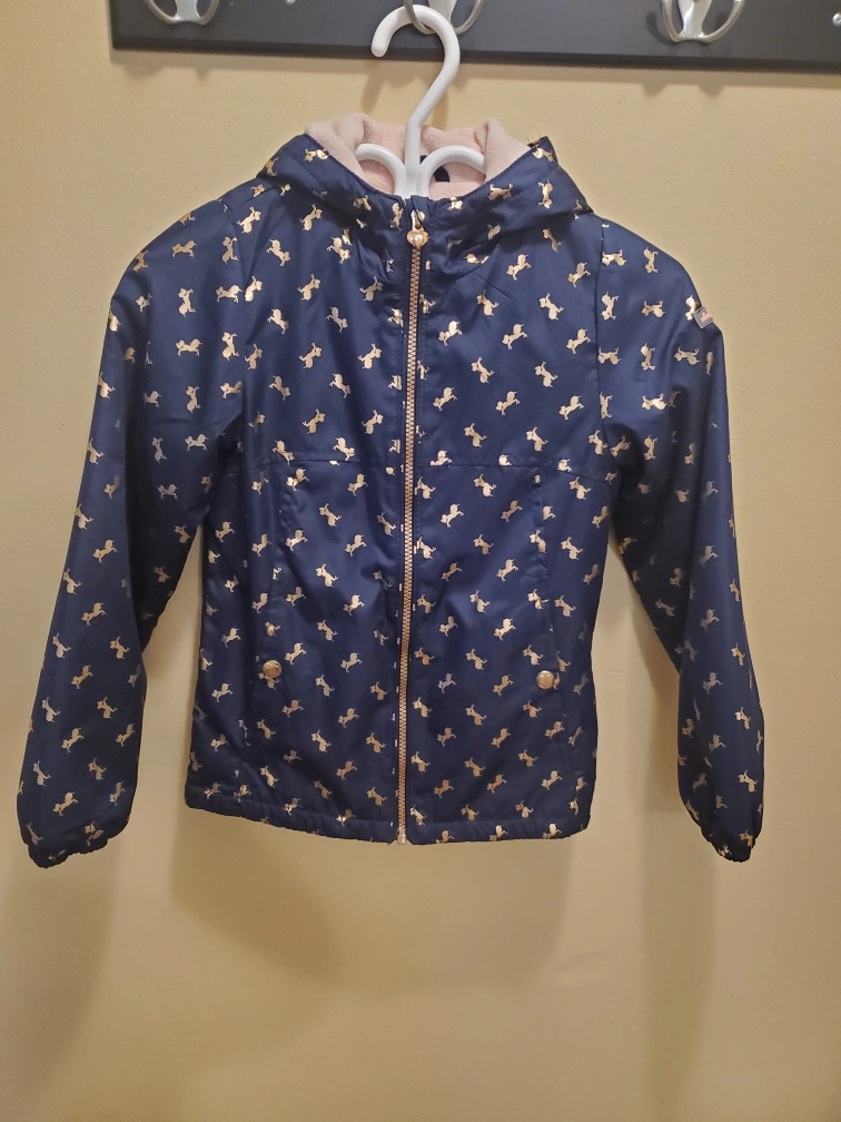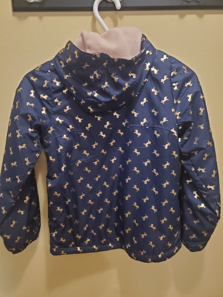 This is a cute OshKosh B'gosh jacket for girls! It features a navy blue outer layer with a gold unicorn pattern and a soft pink fleece lining. The size is 8, perfect for keeping your little one warm and stylish.