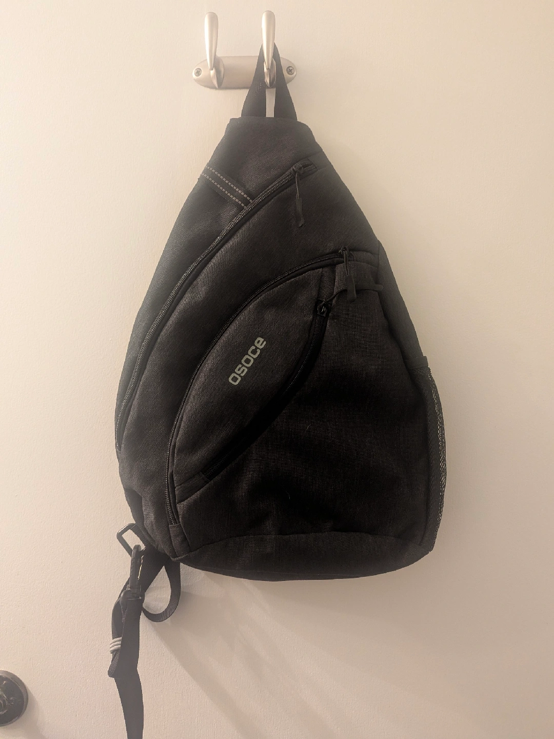 Selling a black Osoce sling bag with RFID pocket. It's in great condition. If the ad is up, it is available.