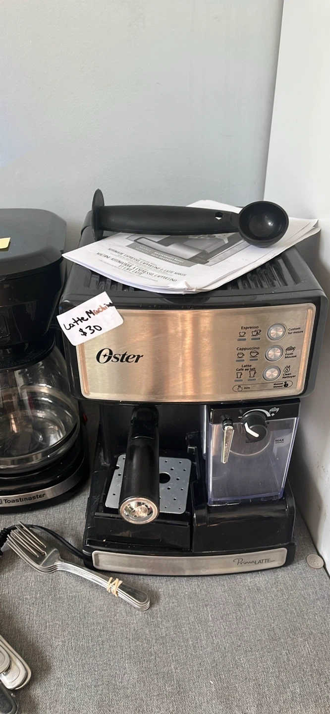 Selling an Oster PrimaLATTE espresso and cappuccino maker. It has settings for espresso, cappuccino, and latte. It also has a custom setting . Works great we just no longer need since we’re moving to another country.