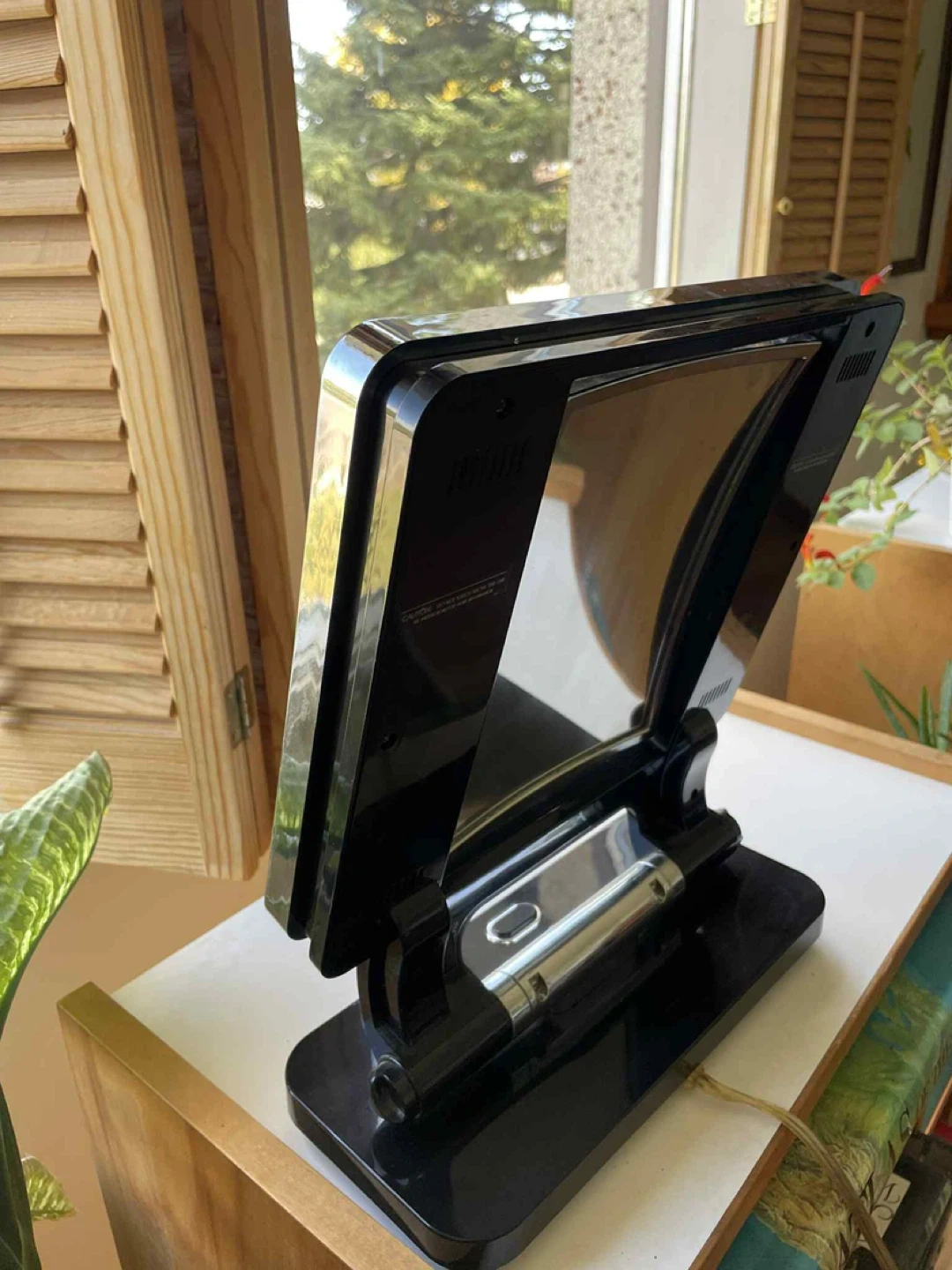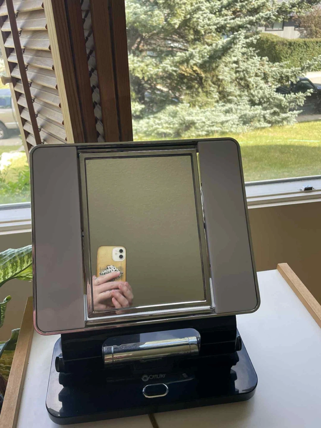 OttLite's ClearSun LED technology for natural daylight illumination, designed for accurate makeup application Regular mirror and magnifying mirror, easily adjustable Plugs into wall Great condition, hardly used.