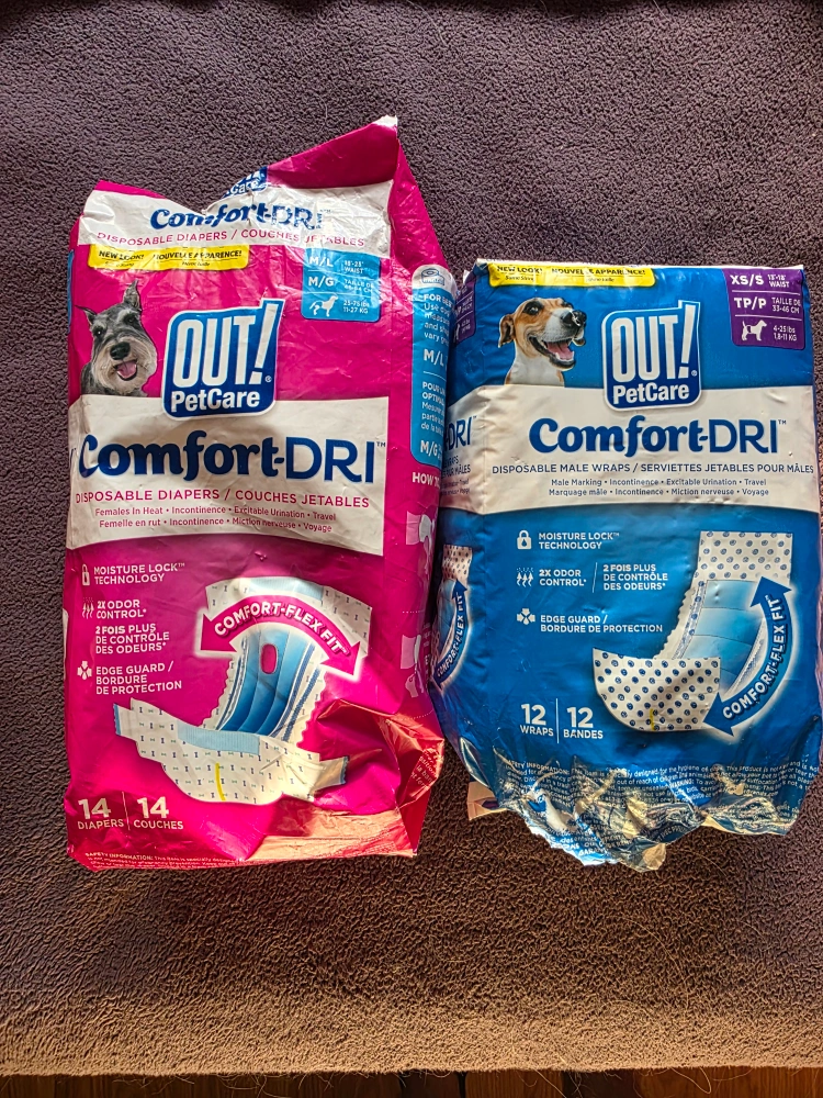 I have some packages of OUT! PetCare Comfort-DRI disposable diapers for dogs. One package is for male dogs, size XS/S (13-18" waist), with 12 wraps. The other is for female dogs, size M/L (25-35 lbs), with 14 diapers. They feature moisture lock technology and 2x odour control.