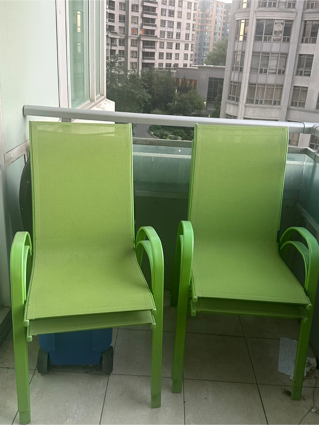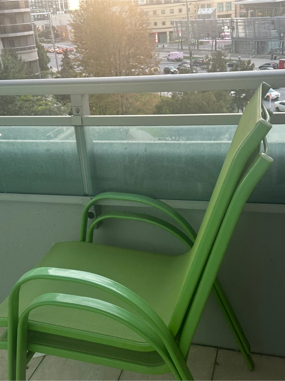 Selling a set of 6outdoor patio chairs in a vibrant green colour! These chairs are perfect for relaxing on your balcony or patio. They're in great shape and ready for a new home. Perfect for enjoying the nice weather!