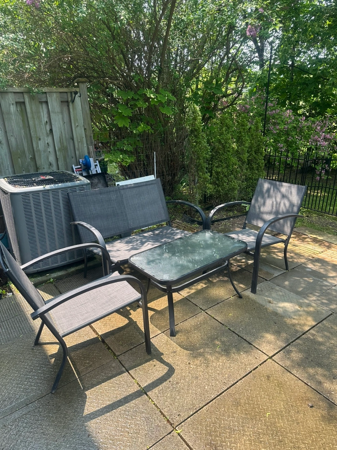Patio set with a glass top table and two chairs plus a small bench. Chairs appear to be made of a metal frame with fabric seating. Metal table and chair legs, and the set would be lovely for enjoying a morning coffee.