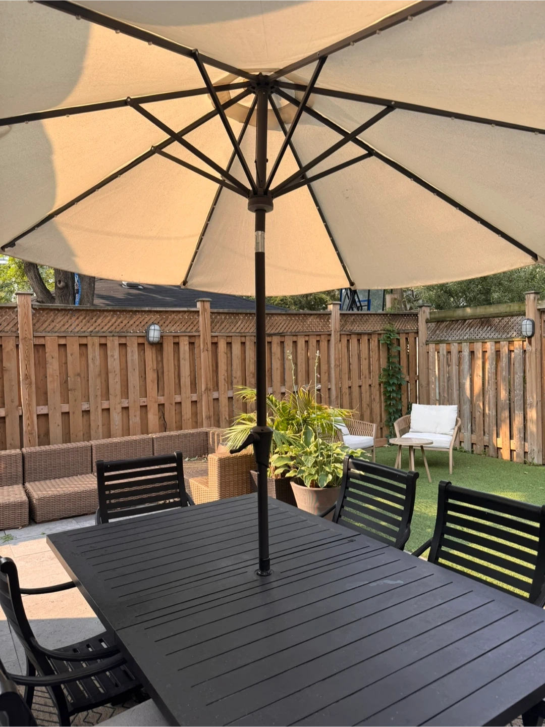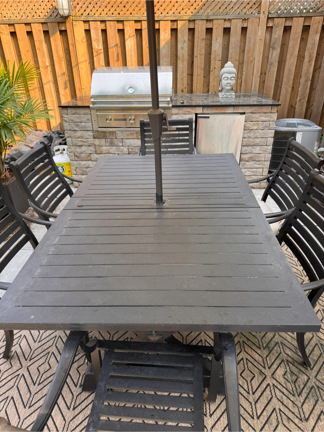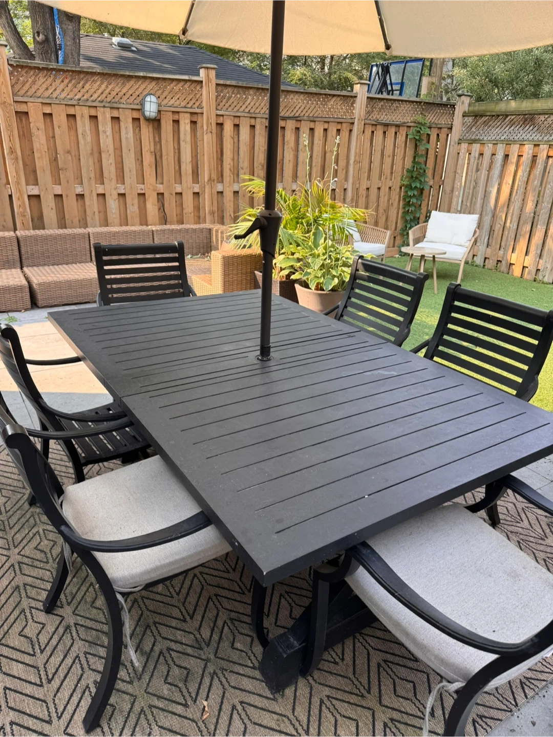 Selling a lovely outdoor patio table and chairs set. It's a great addition to any backyard or patio space. The set includes a large table and several chairs, perfect for enjoying meals or relaxing with friends and family outdoors. It's in good condition and ready for a new home! It is made of steel and never gets damaged in the winter.