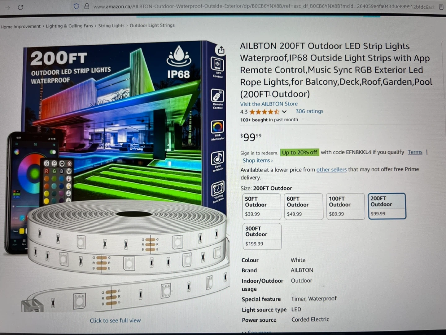 Waterproof outdoor LED Strip lights. Color: RGB, multi color Length: 200ft BRAND: AILBTON Control: Remote and ios & android app LED lights