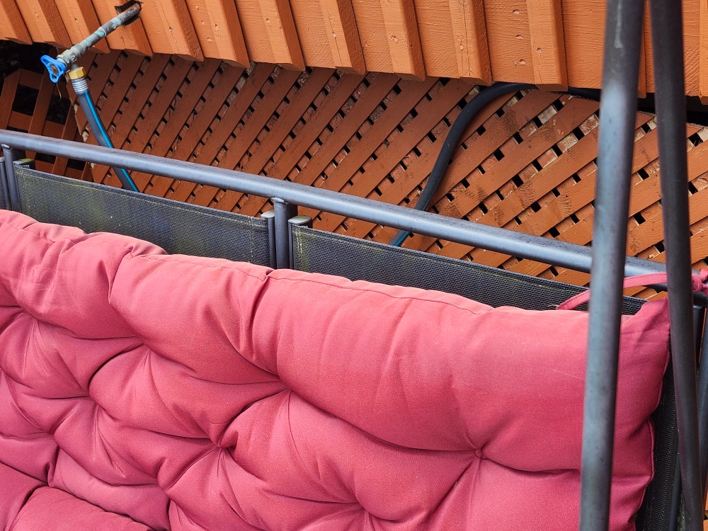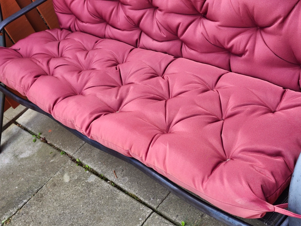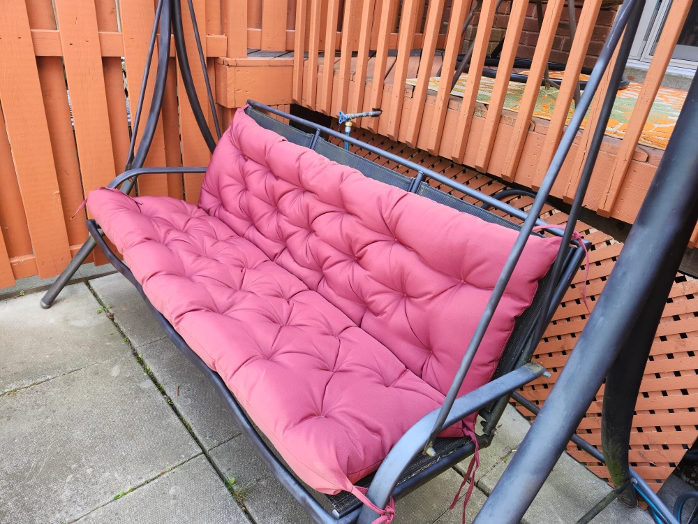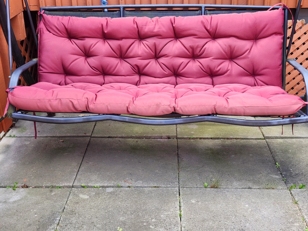 Selling a comfy outdoor swing seat cushion in red-burgundy! It's in good condition and perfect for relaxing on your porch or patio. The cushion is nice and plush, making it super comfortable for lounging. It has a lovely quilted design too. The swing is NOT included!