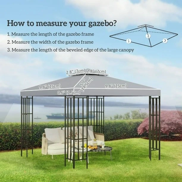 If you are seeing this Ad, then this item is still available This sale is for 1 NEW Outsunny 10' x 10' Square 2-Tier Gazebo Canopy Replacement Top Cover Outdoor Garden Sun Shade, Light Grey Bringing your gazebo back to life is super easy with this 10x10 gazebo replacement canopy from Outsunny. Made from high-quality polyester with PA coating for durability and protection against the sun, it features a two-tier rooftop design to provide air circulation when in use, alongside eight holes for water drainage. The gazebo cover will fit a 10' x 10' gazebo and is great for giving your garden furniture a refresh. Features: • Replacement canopy will fit 3 x 3(m)/9.8' x 9.8' size frame • 180g/㎡ polyester cloth with PA coating • 2-tier rooftop design to provide ventilation • Lightweight and portable • Eight plastic holes for water drainage • Hook and loop fastener straps to attach to gazebo Specifications • Colour: Light Grey • Material: Polyester • Overall Dimensions: 9.8'L x 9.8'W • Small Roof Size: 33.75"L x 33.75"W • Vent Size: 25.25"L x 25.25"W • Ruffle: 7.75" • Item Label: 84C-041GY Pick-up in Pickering ONLY These items come from a smoke-free home.