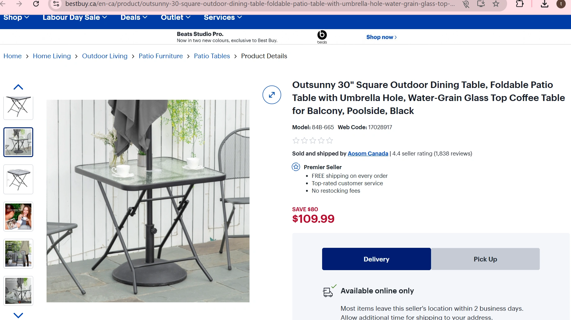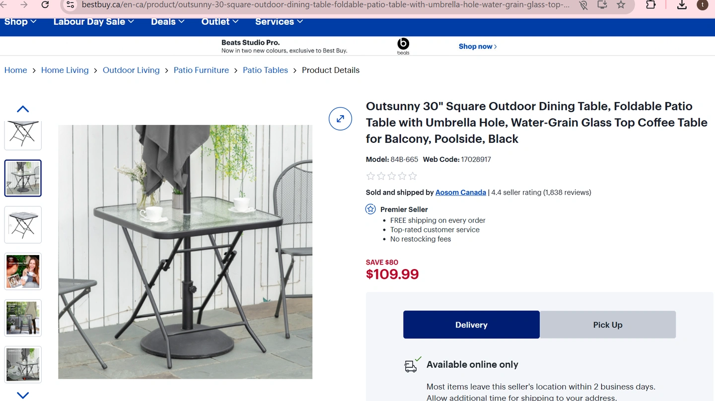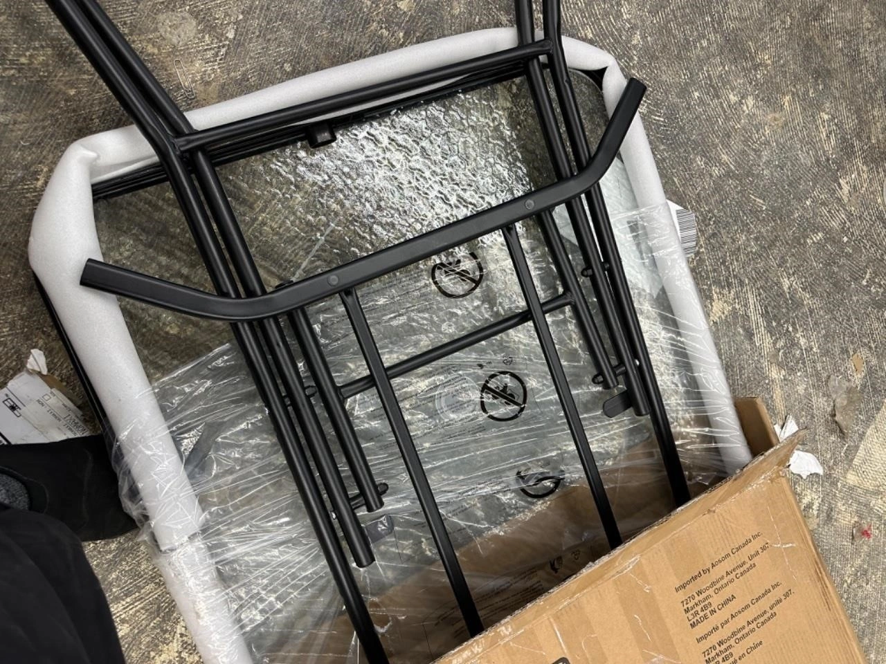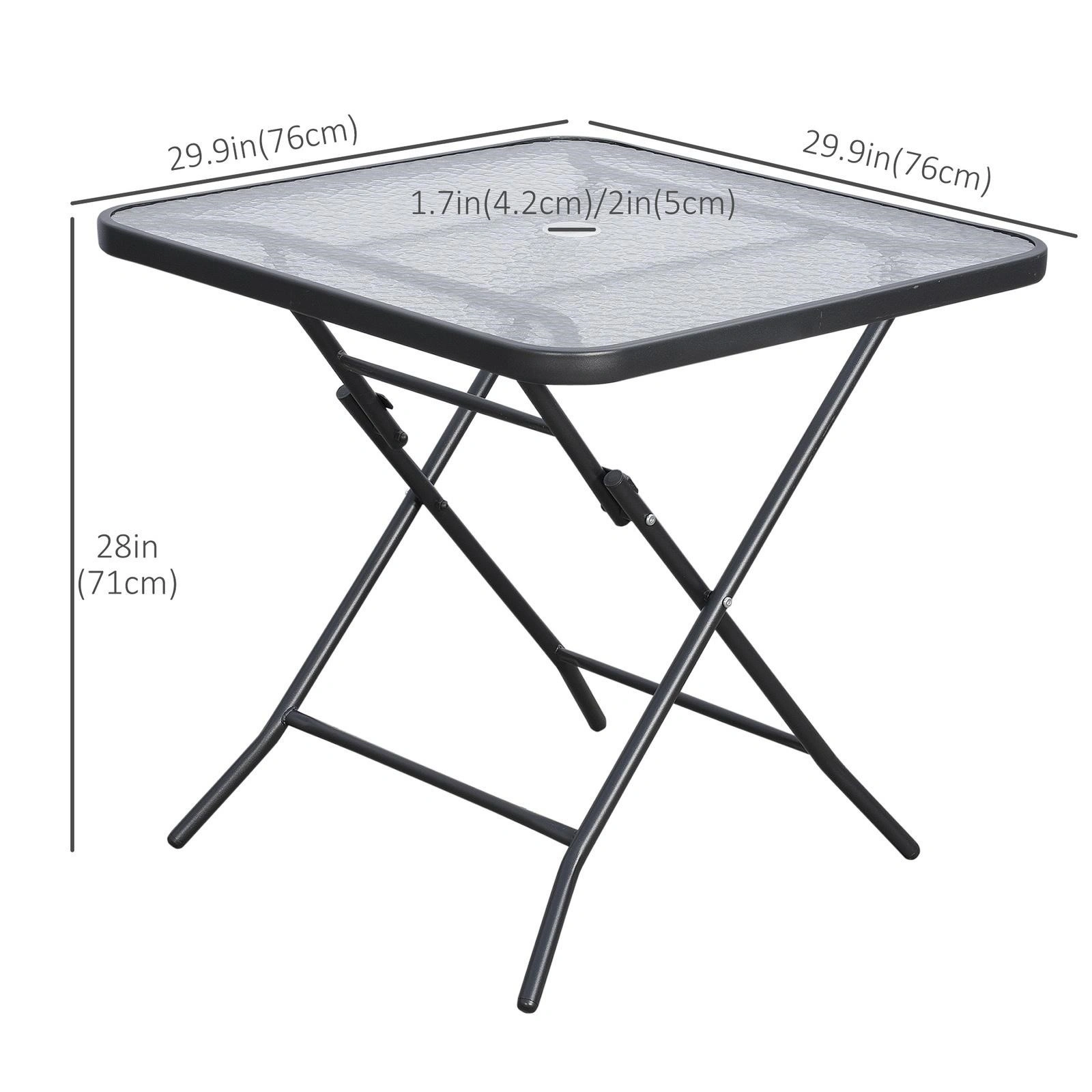 Listed on Amazon and Best Buy for $110. Outdoor Dining Table: This square glass dining table will be adding style to your space, great for relaxing and eating with family and friends in your garden, patio and balcony. - Foldable Design: Our outdoor patio table can be folded down for easy translation or convenient storage in a small area when not in use. No assembly is required, just unfold, and the table is ready to use. - Table with Umbrella Hole: The patio dining table has a water-grain tempered glass top for easy cleaning with a damp cloth. There are two sizes( 1.7" ( 4.2 cm) & 2" ( 5 cm)) of umbrella holes in the middle, suitable for 1.5" (3.8cm), 1.9" (4.8cm) diameter umbrella pole securely in place, stay cool in the outside(Umbrella not included). - Made for Outdoors: Our patio table is made of a metal frame with a powder coating finish, which protects furniture from mild to medium-level outdoor elements. Featuring anti-slip footpads to keep balance and prevent the floor from scratching. - Garden Table Info.: Overall Dimension: 29.9" L x 29.9" W x 28" H (76 x 76 x 71 cm), Foldable Dimension: 39.4" L x 29.9" W x 3.5" H (100 x 76 x 9 cm), Weight Capacity: 110lbs (50kg). Overall Dimensions: 29.9"x 29.9"x28" Weight Capacity: 110 lbs Leg Length: 67.5 Centimeters Item Weight: 24.2 lbs Number of Height Positions: 1 Minimum Required Door Width: 10 Centimeters Collapsed Length Minimum: 100 Centimeters Umbrella Hole Diameter: 50 Millimeters Brand new, Factory packaging Condition: Brand New