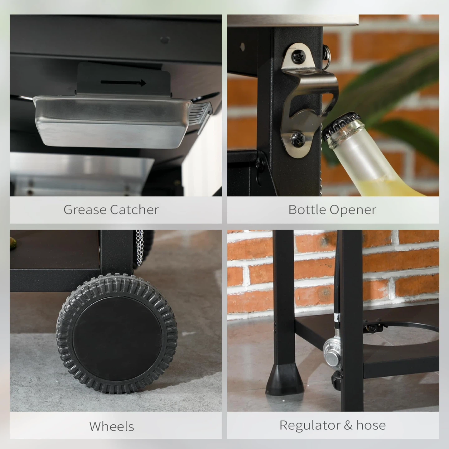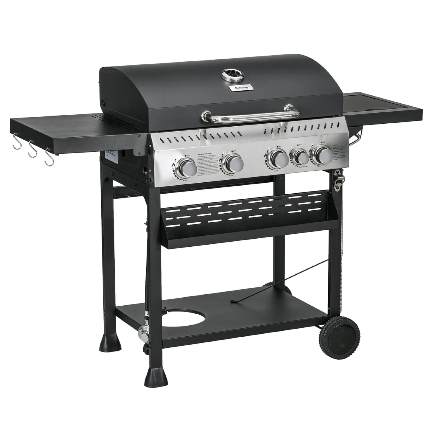 Brand Outsunny Product Dimensions 53D x 135W x 101H Centimetres Special feature Grease Catcher, Thermometer gauge, Whees Colour Black Fuel type Gas Recommended uses for product Outdoor 4+1 Burner Gas Grill: Our gas bbq grill is propane powered with five independent burners. Each burner is with piezo ignition, which you can operate separately. Garden Party Ready: Our gas grill comes with a grilling area of 430 square inches, great for cooking up 6-12 servings to friends. Also comes with a convenient warming rack to keep food warm and maintain flavor. Convenient Temperature Control: The built-in lid saves heat; a thermometer gauge on the lid indicate internal temperature changes clearly to monitor when food is cooked to your preference. Multiple Storage: No need to worry about figuring out a place to put lots of plates, seasonings, or anything else; look at the storage rack beside and underneath the grill, the front spice rack and the side hooks, and your answer appears. Other Details: The outdoor grill comes with grease catcher for hassle-free grease cleanup. With a bottle opener so you'll always have one around when you need it. A convenient wheeled design allowing easy movement around your backyard. Regulator and hose are included and pre-installed.
