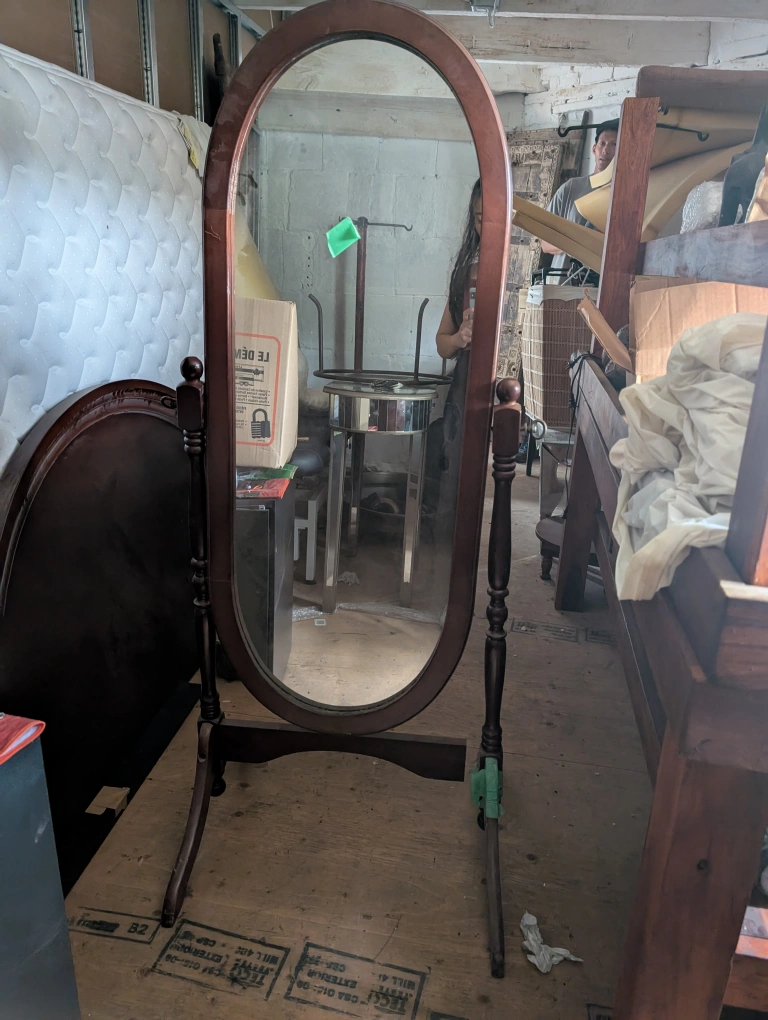 Selling a lovely oval-shaped cheval mirror! It features a rich brown wood frame and a classic design that would look great in any bedroom or dressing area. It's a full-length mirror, perfect for getting a good look at your outfit. it's missing a screw in the bottom.