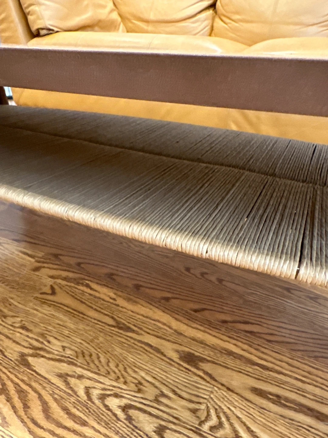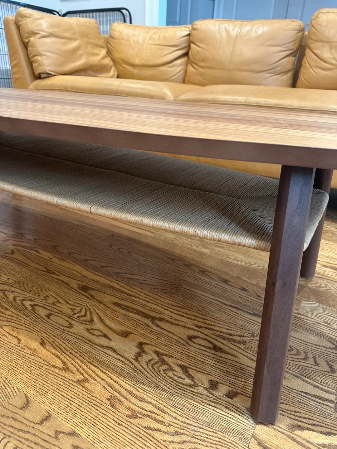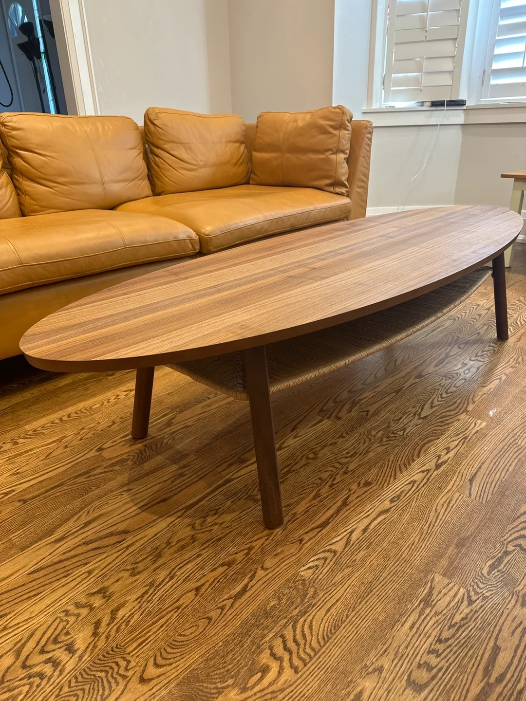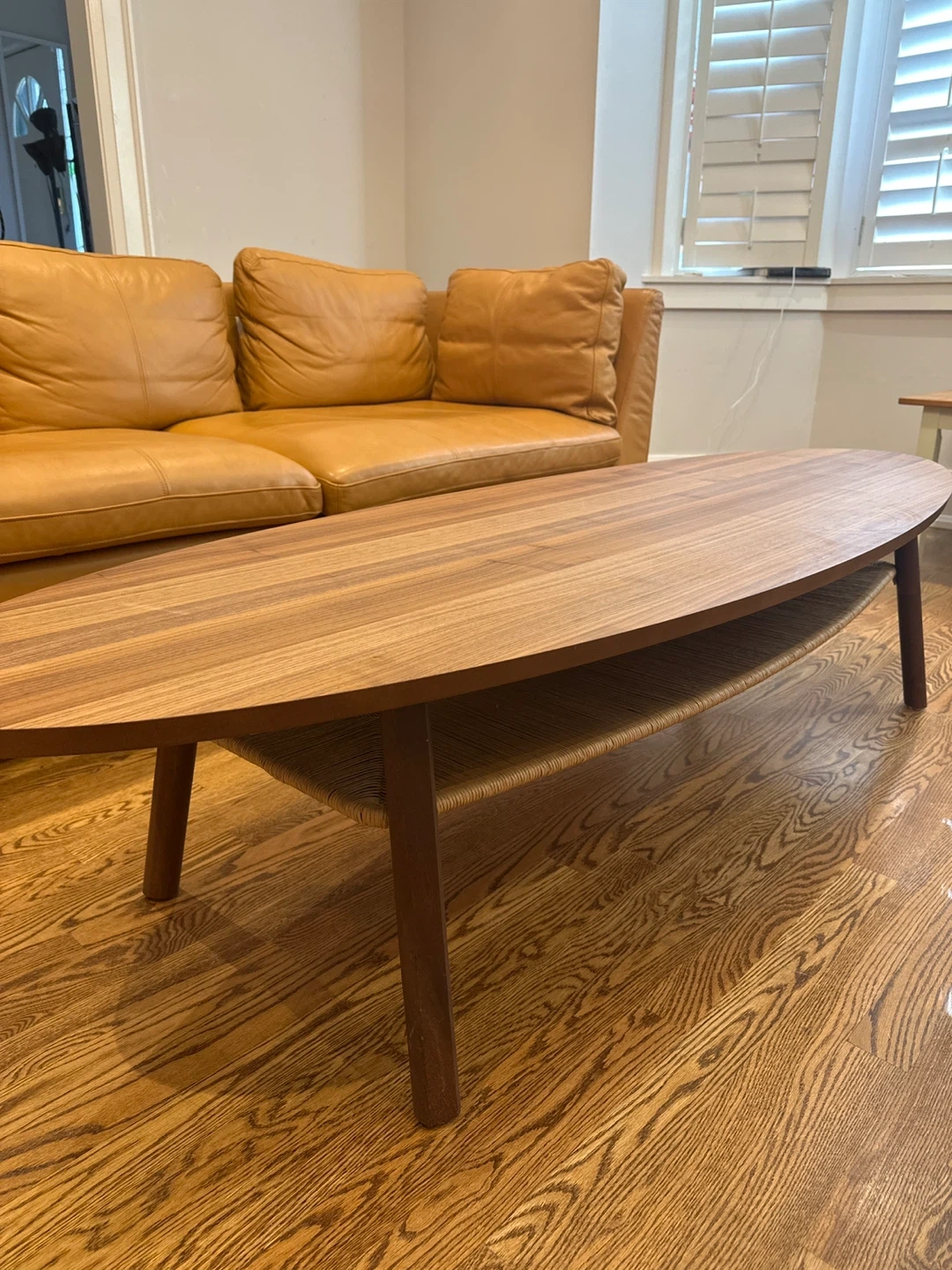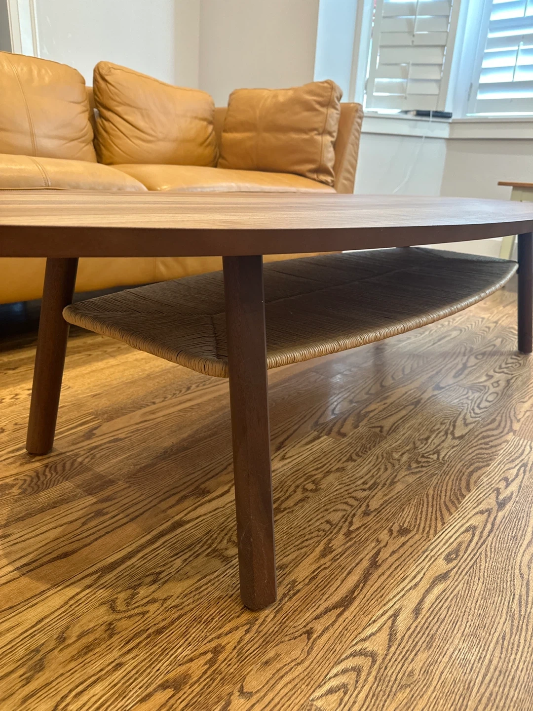 Elegance and Gorges wood coffee table. Great condition by Gently used oval coffee table. It's made of wood and has a woven shelf underneath for storage. A stylish addition to any living room!