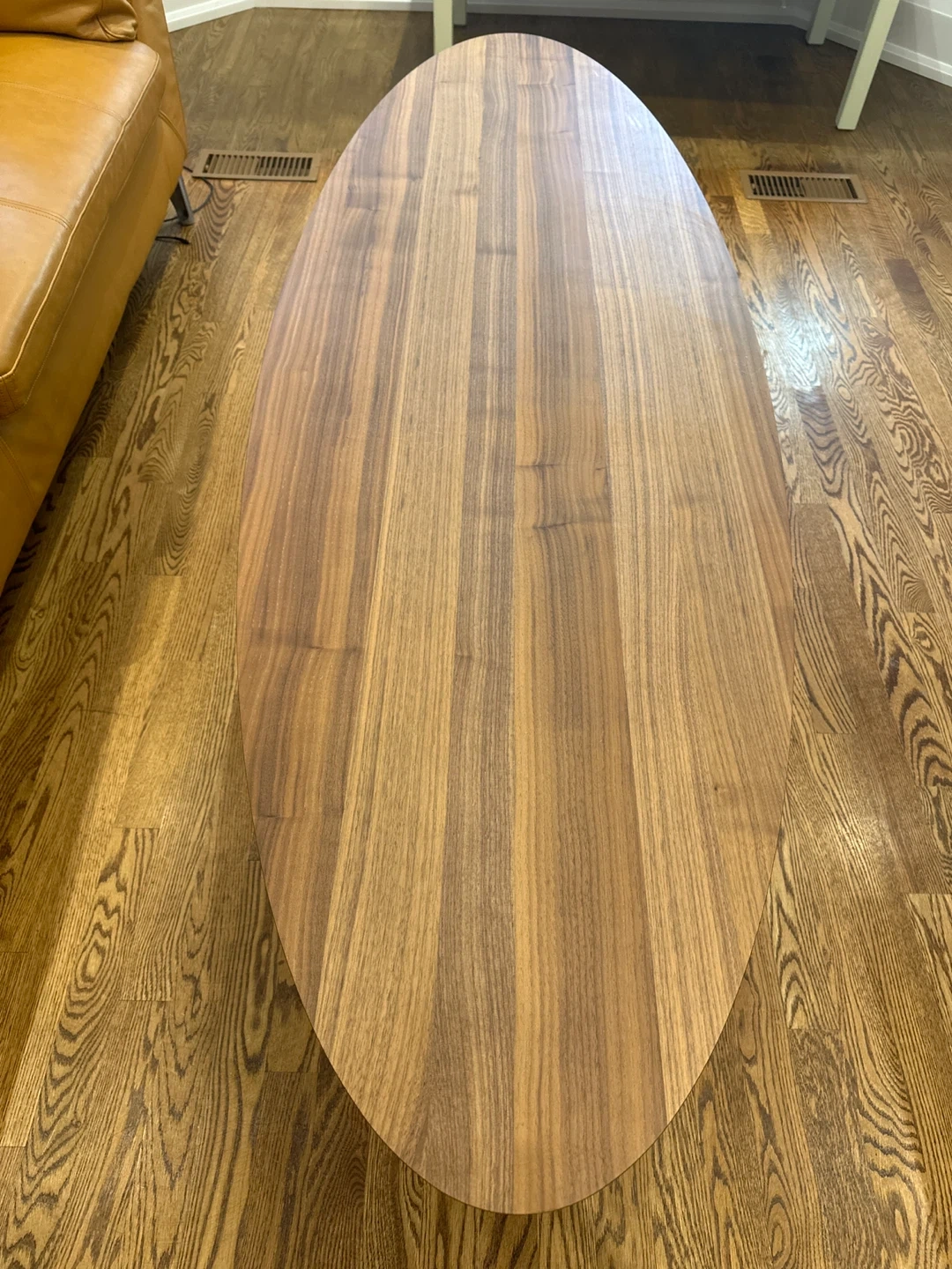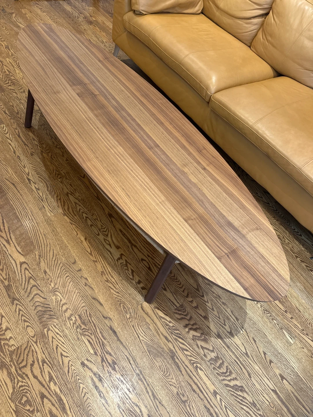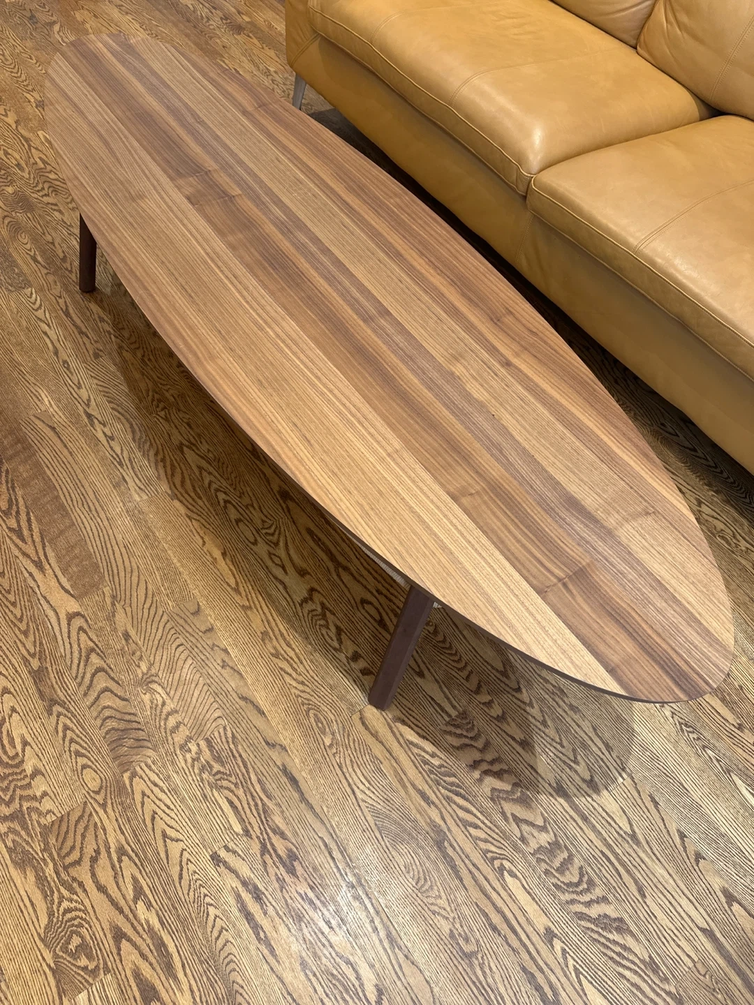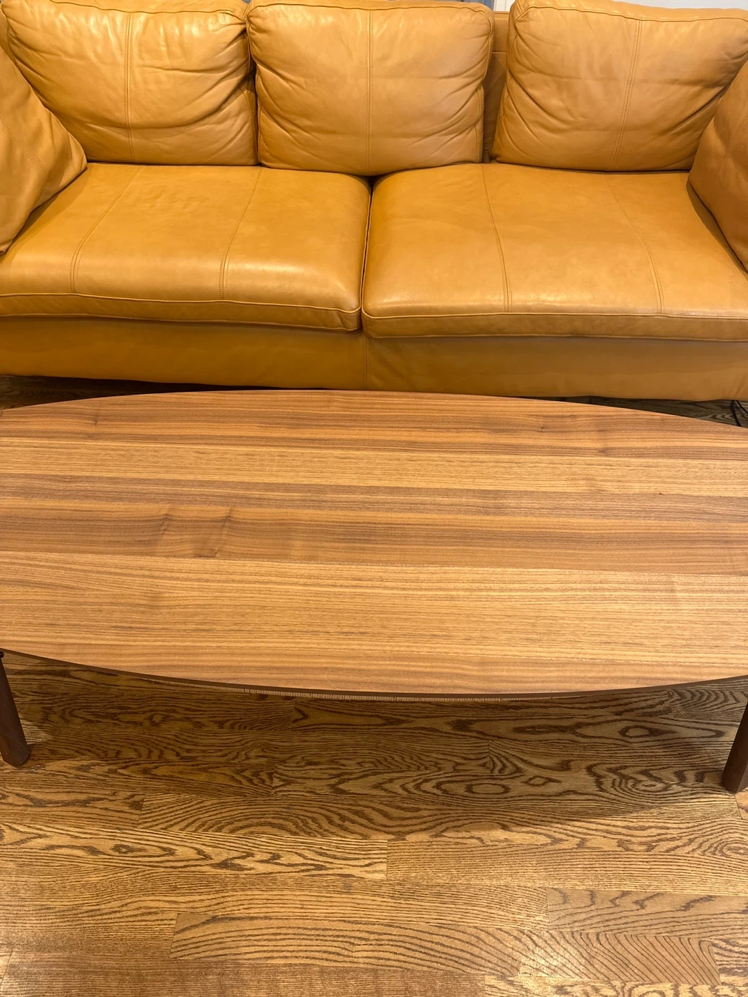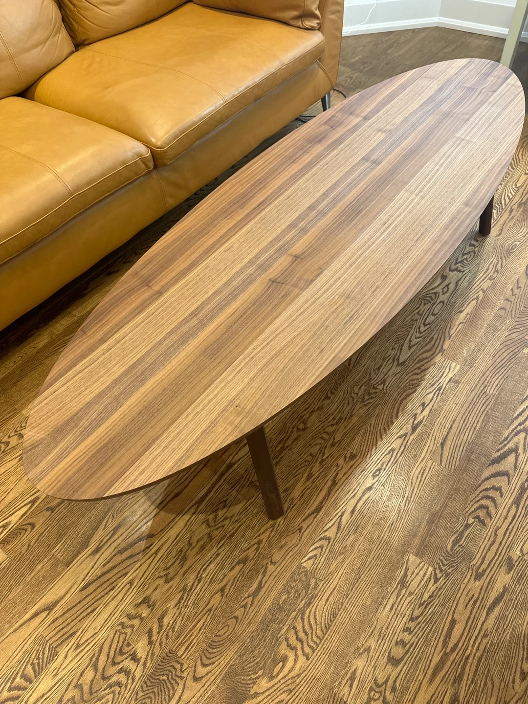 Elegance and Gorges wood coffee table. Great condition by Gently used oval coffee table. It's made of wood and has a woven shelf underneath for storage. A stylish addition to any living room!
