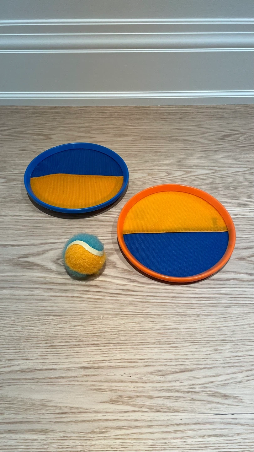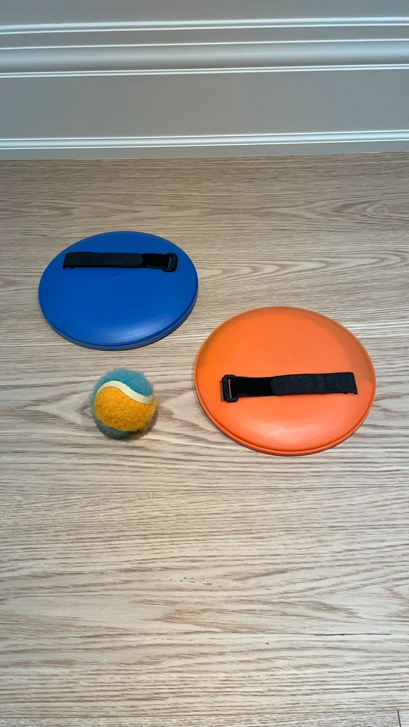 Get ready for some fun with this paddle catch ball set! It includes two paddles, one in blue and one in orange, along with a tennis-style ball. Perfect for outdoor games and activities with friends and family
