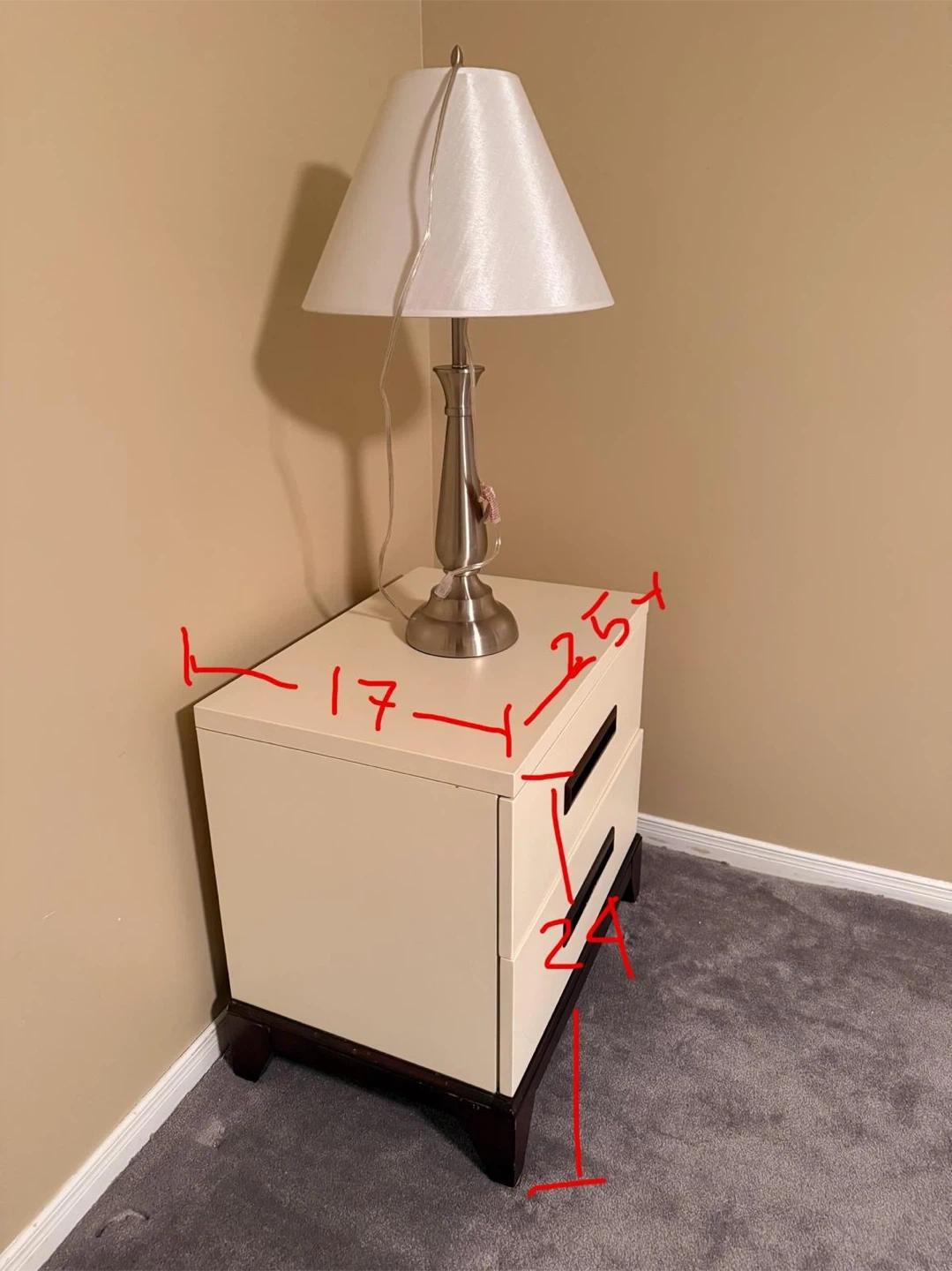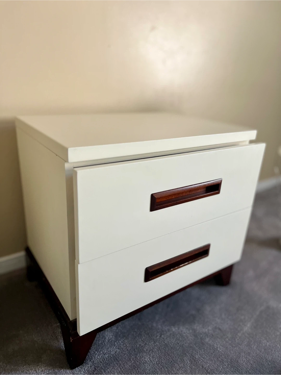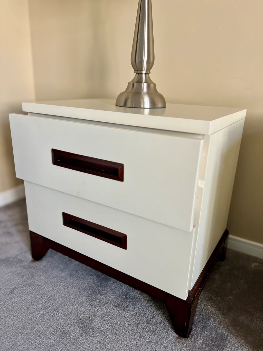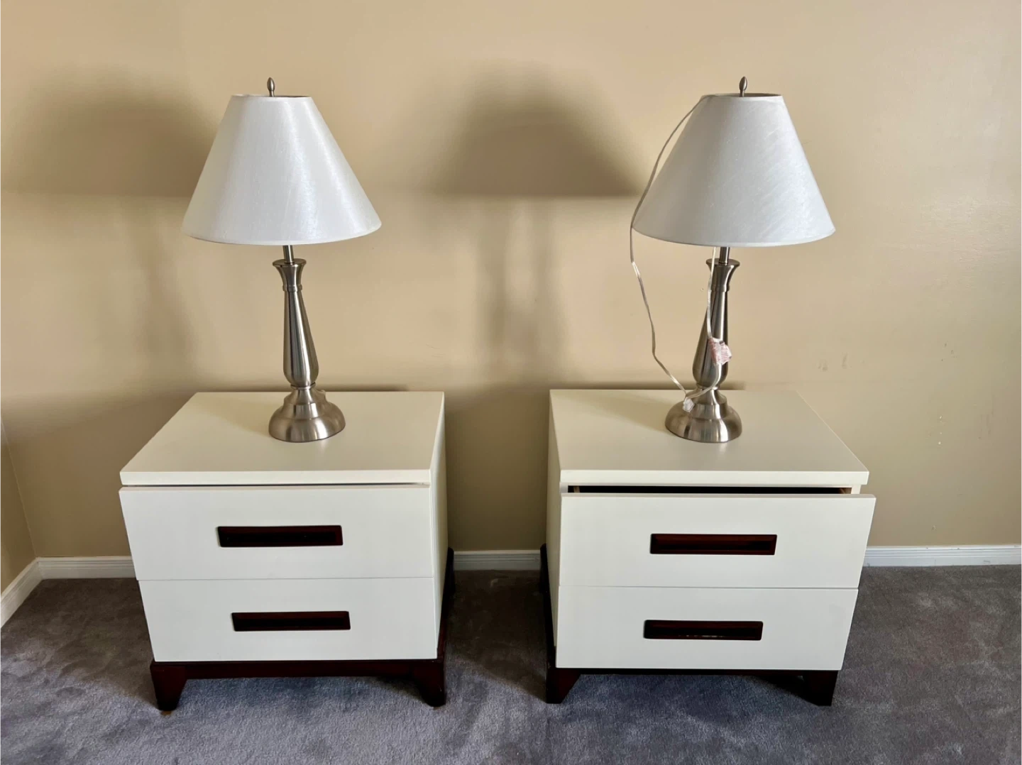 Leon’s - pair of cream-coloured nightstands in a solid wood and great condition. *** lamps not included *** pick up Hamilton Mountview (Scenic Woods)