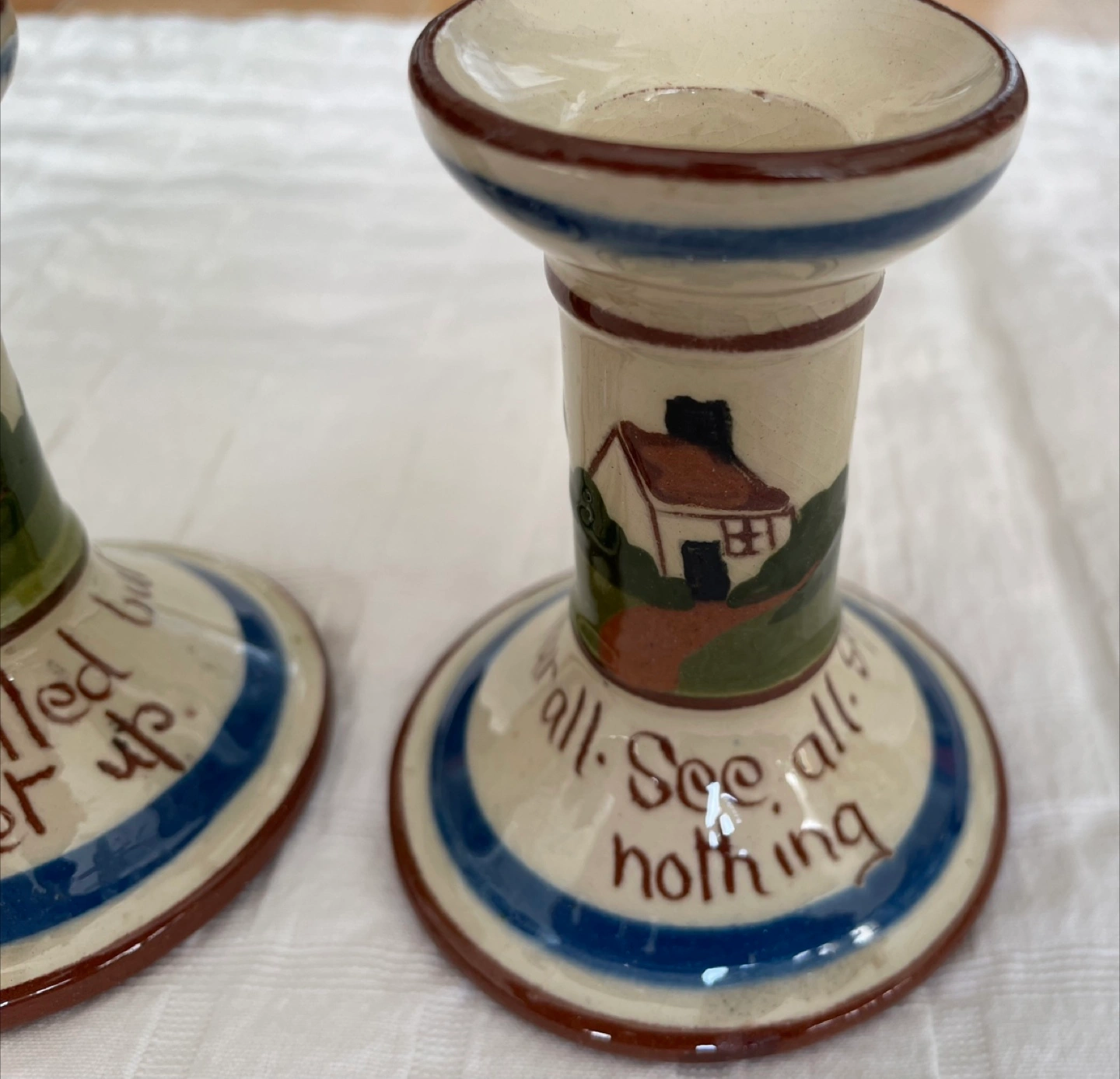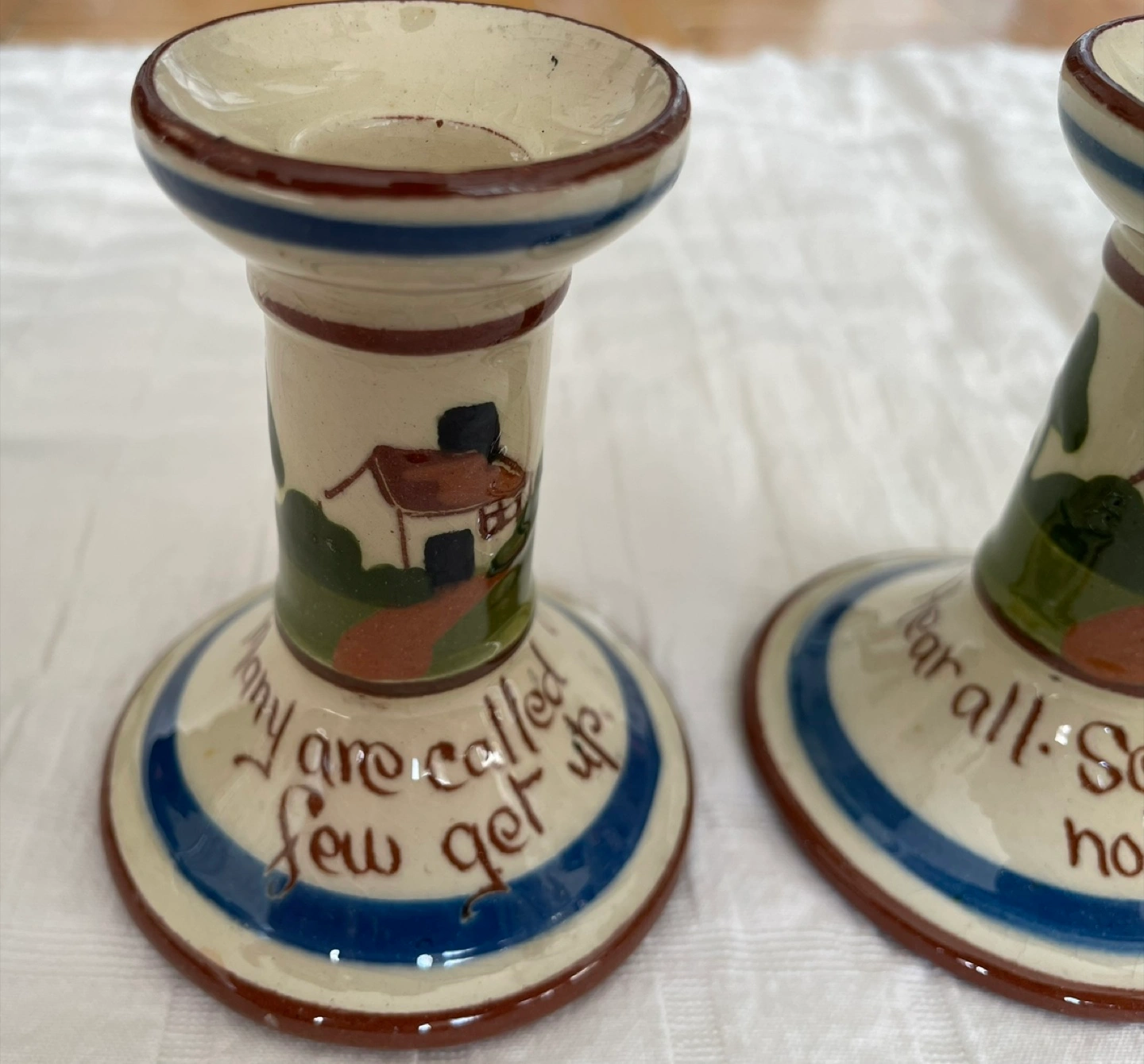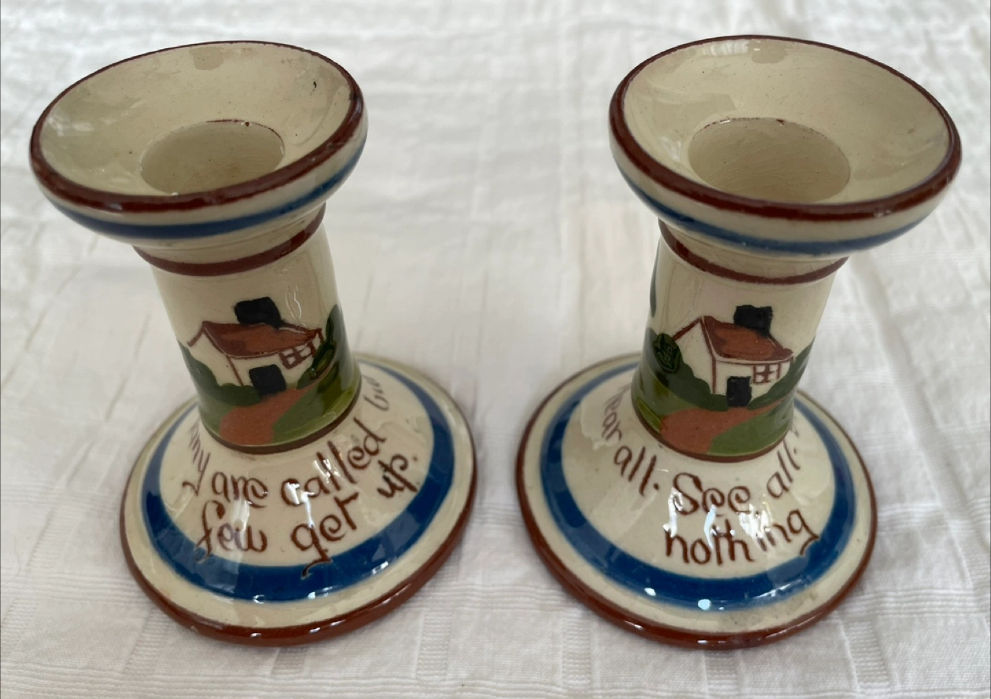 Here's a charming pair of Longpark Torquay candle holders from England! They feature a quaint house design and a lovely blue and brown trim. Perfect for adding a touch of vintage charm to your home decor. Like new, mint condition.