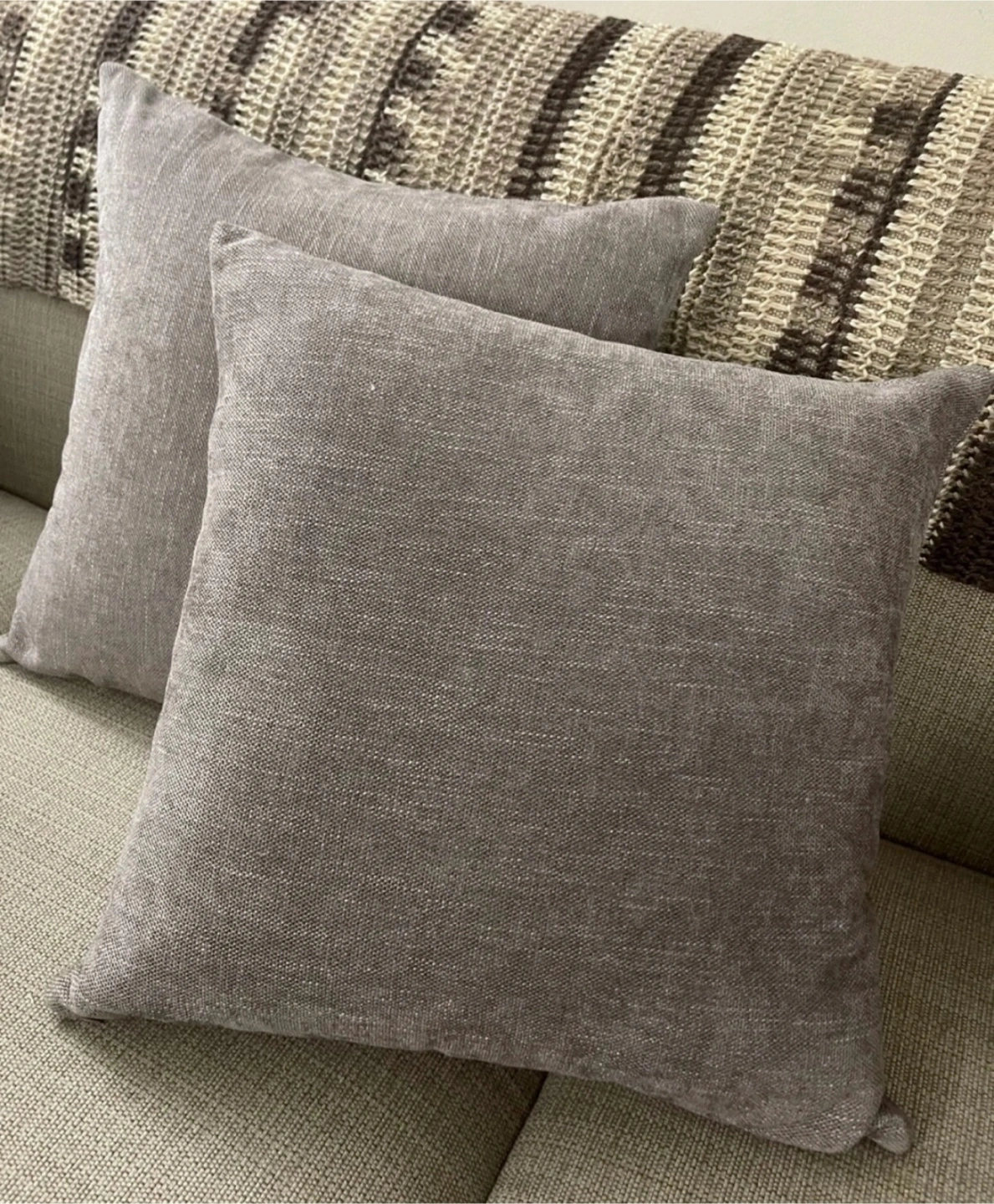 Set of two square decorative throw pillows (cushions). Neutral grey colour scheme. Durable and good quality material. Each cushion cover has a zipper for easy removal and washing. Perfect for living room or bedroom. From smoke-free, pest-free, and pet-free home. Clean and rarely used. Excellent condition. Cash and pick up only. **Feel free to check my other listings** Important Notes: 1) The Karrot platform operates on a "final sale" basis, meaning buyers are responsible for their purchases. No returns, and no refund once the purchase is finalized. 2) Buyers are advised to inspect any item before finalizing the purchase.