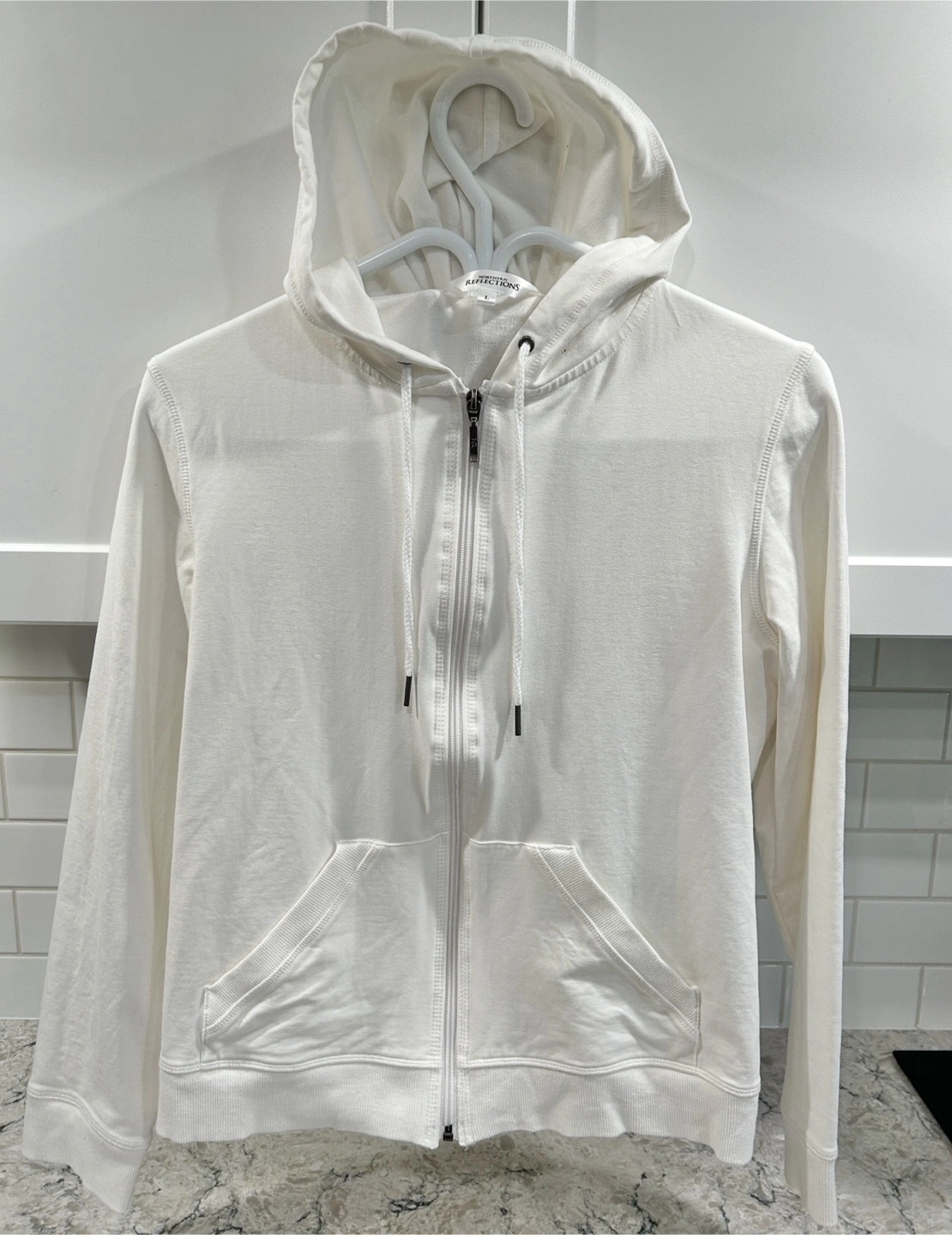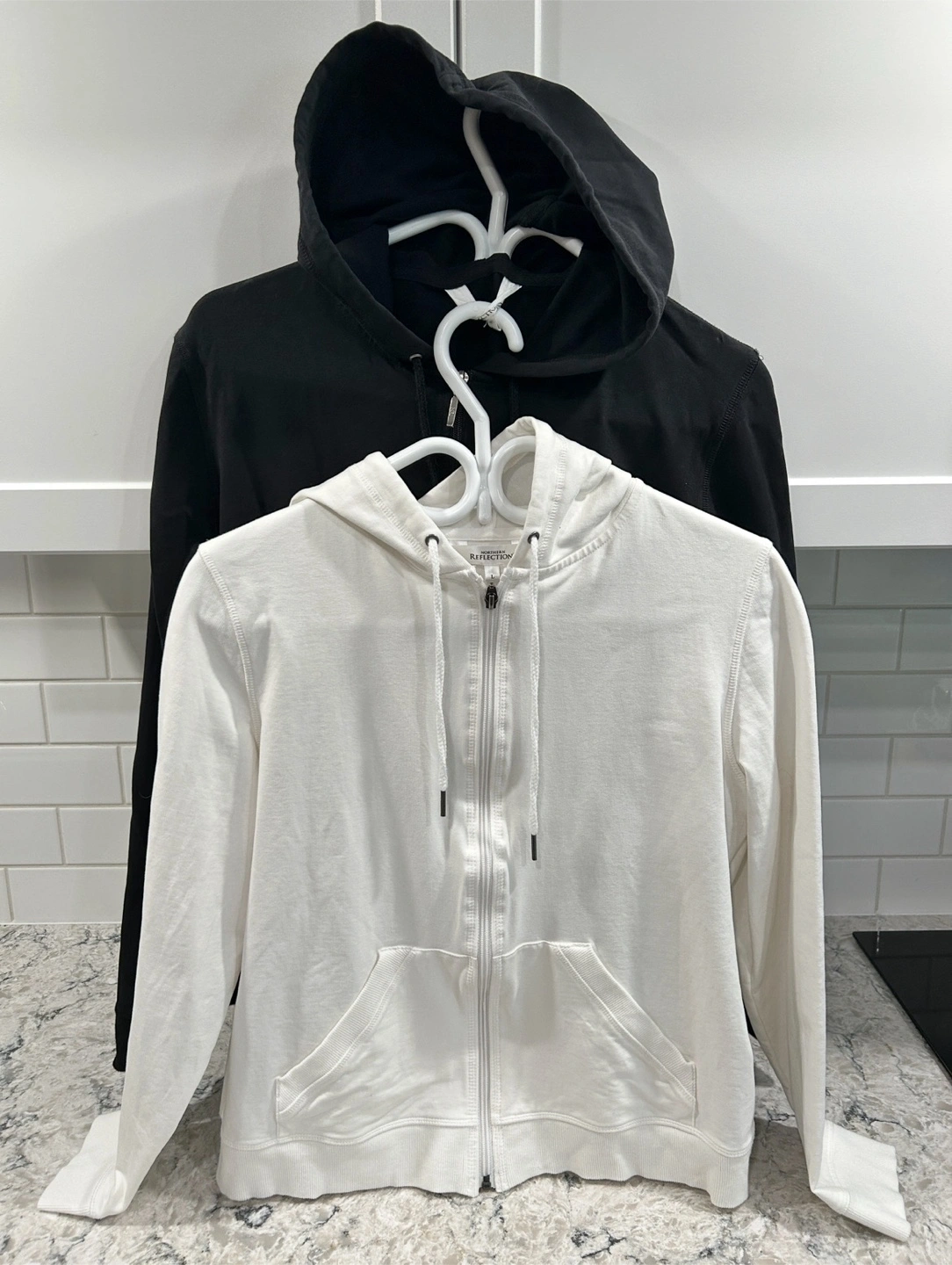Women’s Zip Up Hoodie/Sweater (Northern Reflections) Black and white Size M (do have the white in a large as well) Excellent condition only worn around the house and always hung dried Have 5% spandex in the material so bit of stretch to them retail new for $70 $20 takes them both See other listings for more women’s clothing