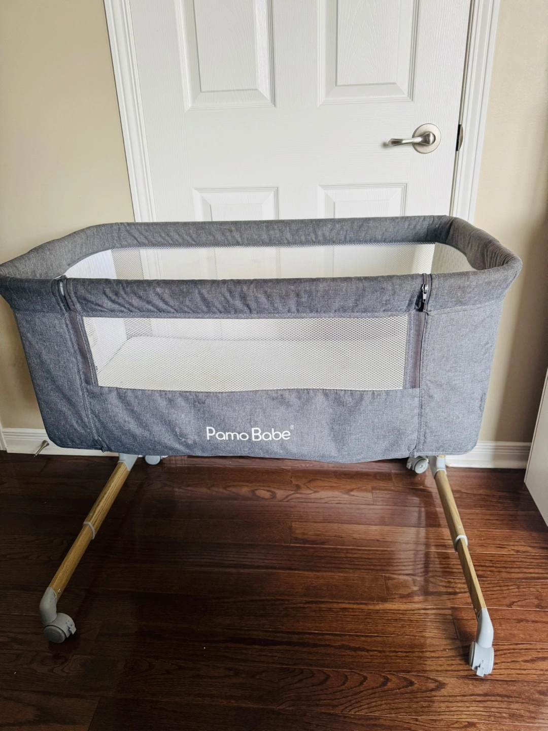 Selling a Pamo Babe bedside bassinet in great condition! It's a lovely grey colour and perfect for keeping your little one close by during those early months. The bassinet is designed to attach securely to your bed, making nighttime feedings and check-ins super easy. It's also on wheels so you can move it around easily