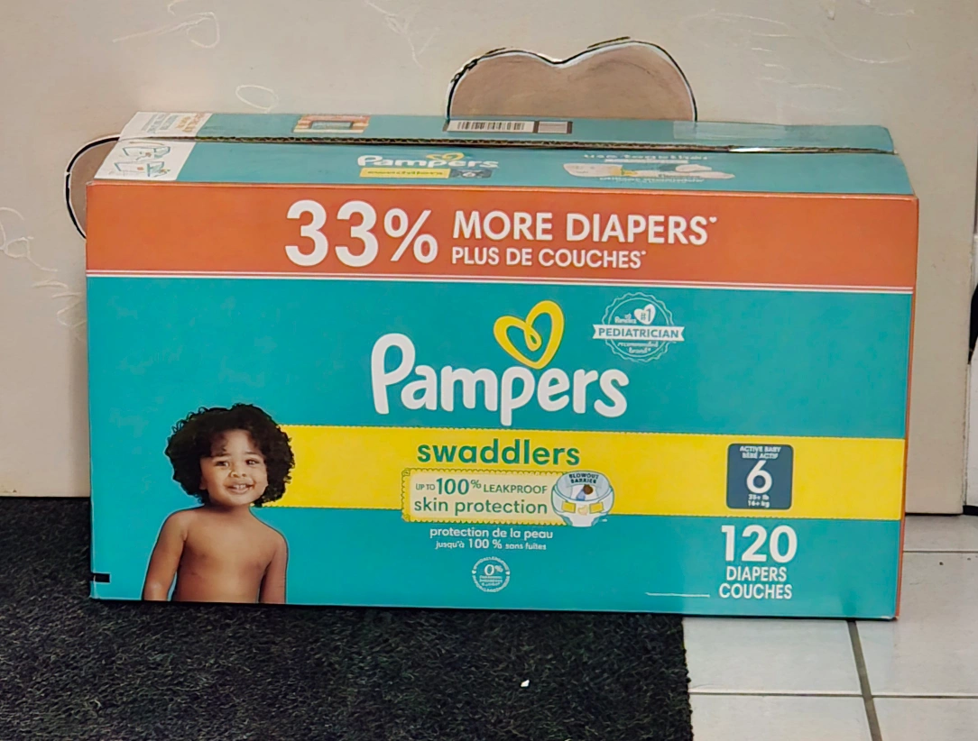 Selling a box of Pampers Swaddlers diapers, size 6. The box contains 120 diapers. These diapers offer up to 100% leakproof skin protection and blowout protection. Perfect for your little one!