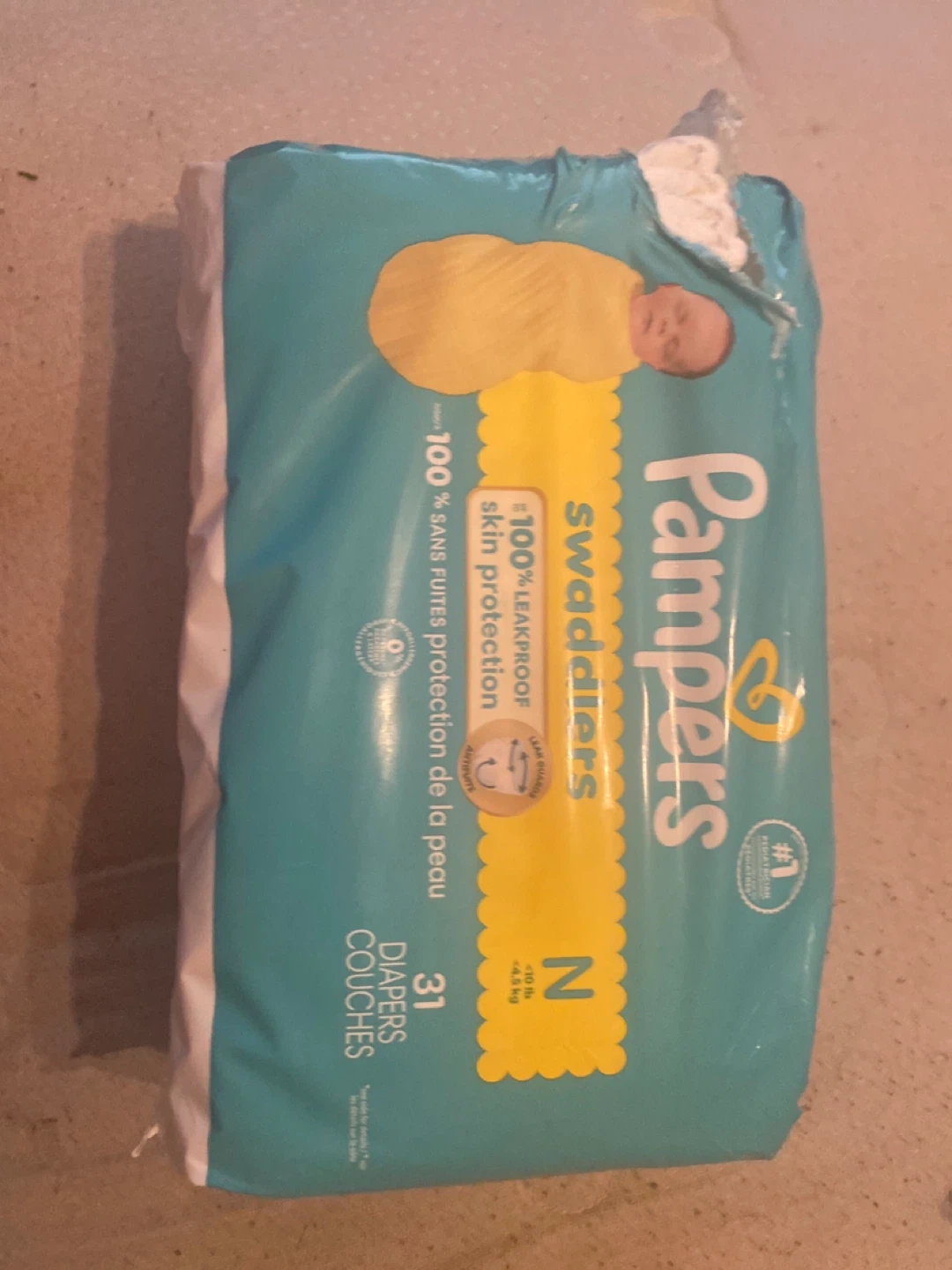 Selling a pack of Pampers Swaddlers diapers, size N (up to 10 lbs / 4.5 kg). The pack contains 31 diapers, offering 100% leakproof skin protection. Perfect for newborns! One out
