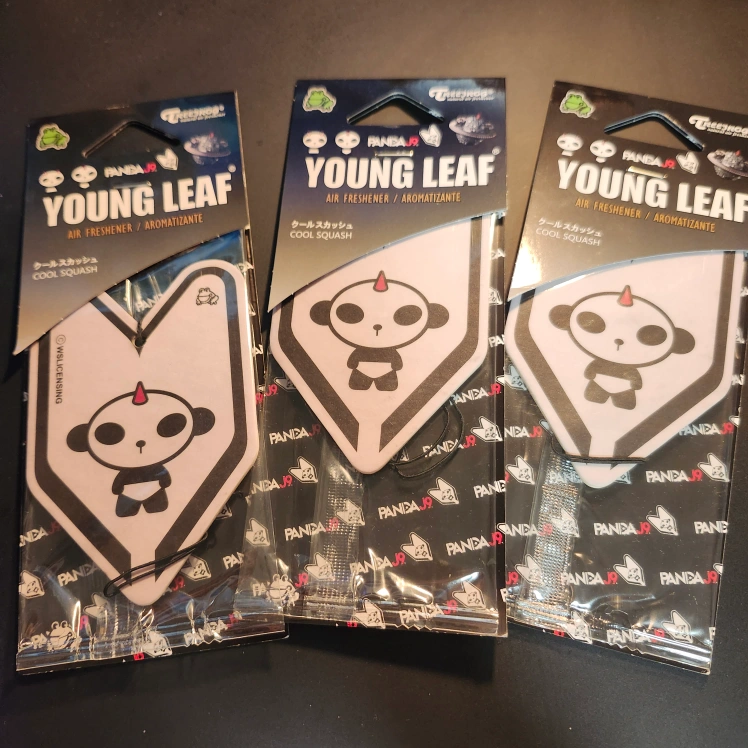 5 each or 12 for all 3! Freshen up your car or small space with these Panda Jr. Young Leaf air fresheners in the Cool Squash scent! Each one features an adorable panda design and comes in its original packaging