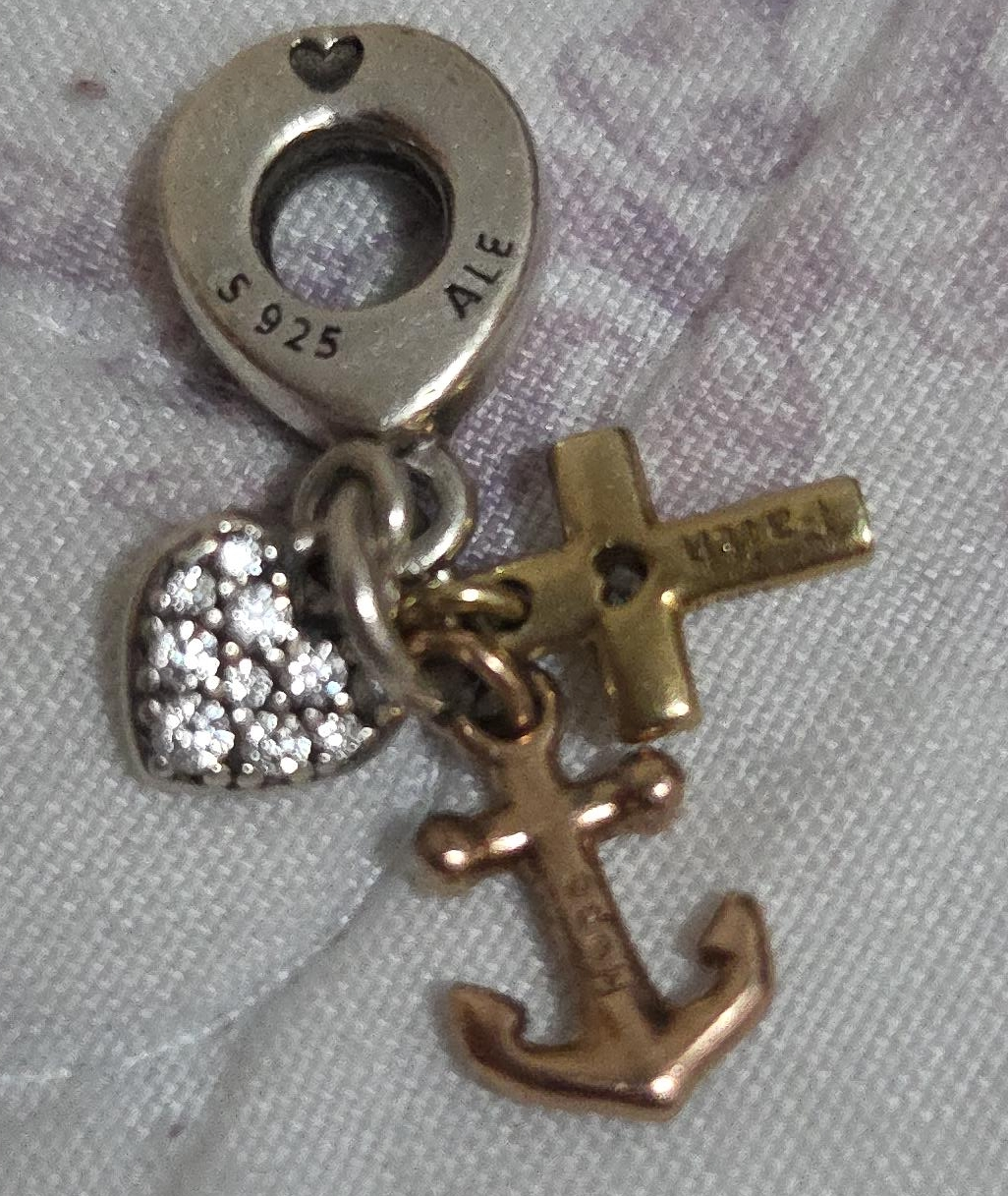 A lovely Pandora charm featuring a heart with clear stones, a golden cross, and a rose-gold anchor. It's stamped with 'S925 ALE', indicating it's made of sterling silver. A beautiful addition to any Pandora bracelet! Open to price negotiations!