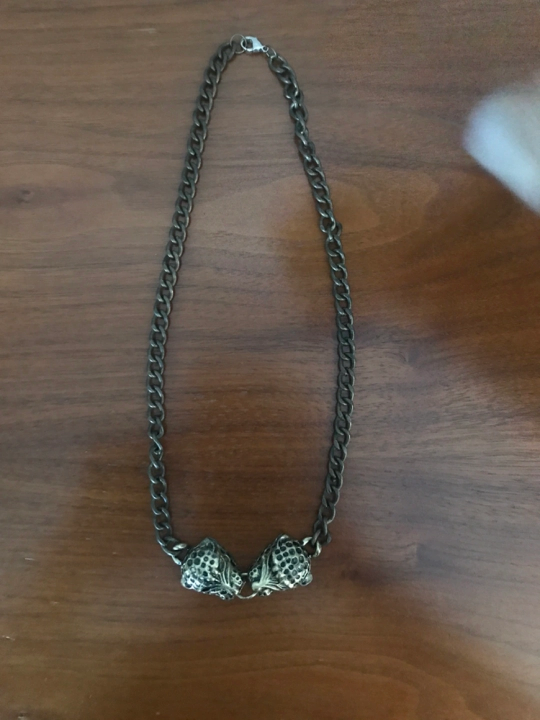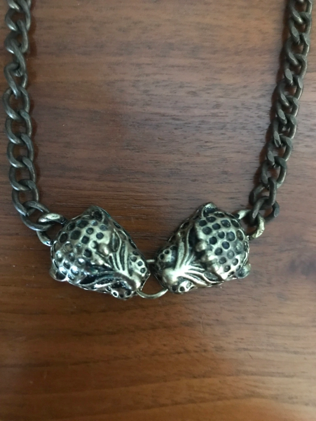 Here's a cool chain necklace featuring two panther heads! It's in great condition and would add a unique touch to any outfit