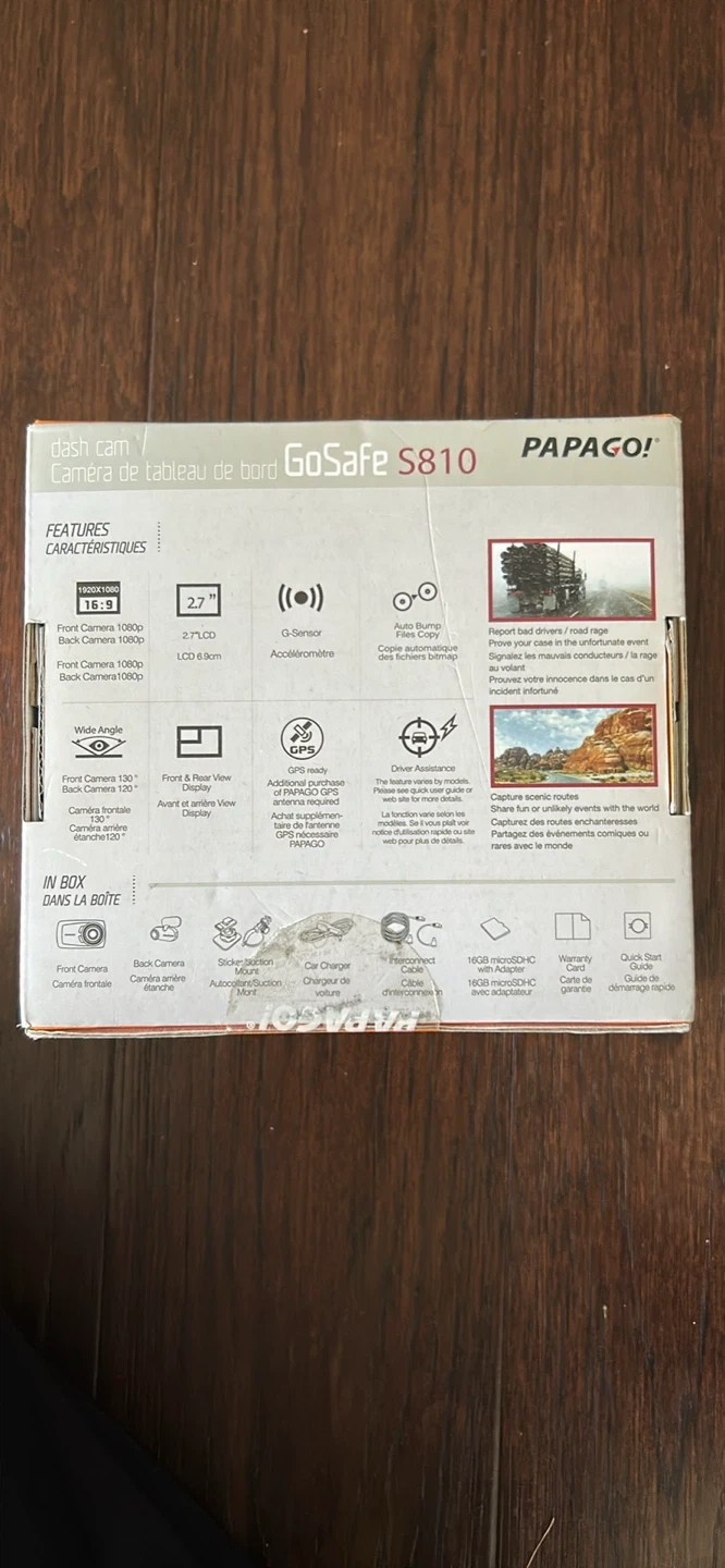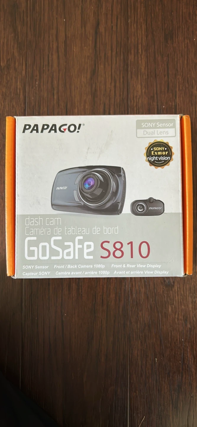 Selling a brand new PAPAGO! GoSafe S810 dash cam, still in its original packaging. It features a Sony sensor and dual lens for excellent front and rear view recording. Key features include: - Front & Rear Camera 1080p - 2.7" LCD screen - G-Sensor - Wide angle lens - Includes front camera, back camera, sticker button, car charger, 16GB microSDHC card, and quick start guide