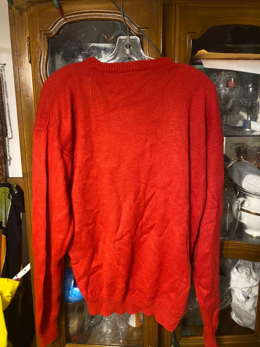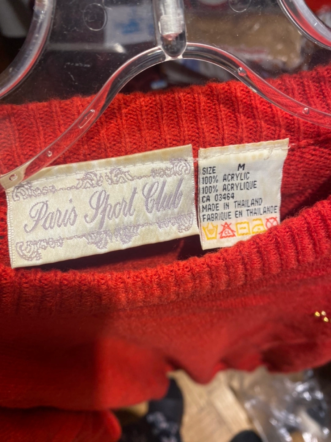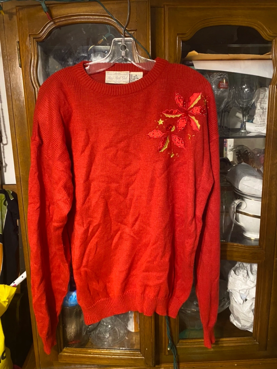 Red acrylic Christmas sweater. Features poinsettia design. Size medium. Made in Thailand. Good condition Cash only