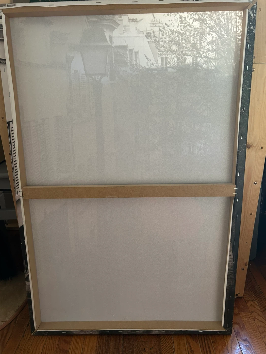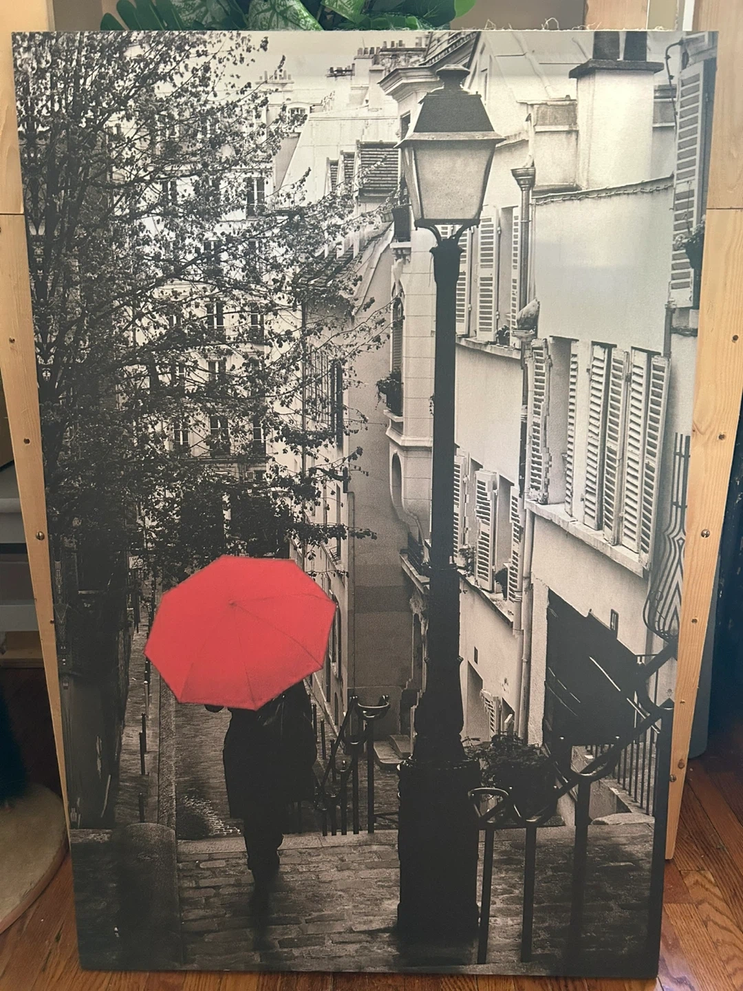 This is a beautiful canvas print featuring a black and white Parisian street scene with a pop of colour from a red umbrella. It's a great piece of wall art to add a touch of Parisian charm to any room Size is 24” x 36” Porch pickup Cash only Priced right