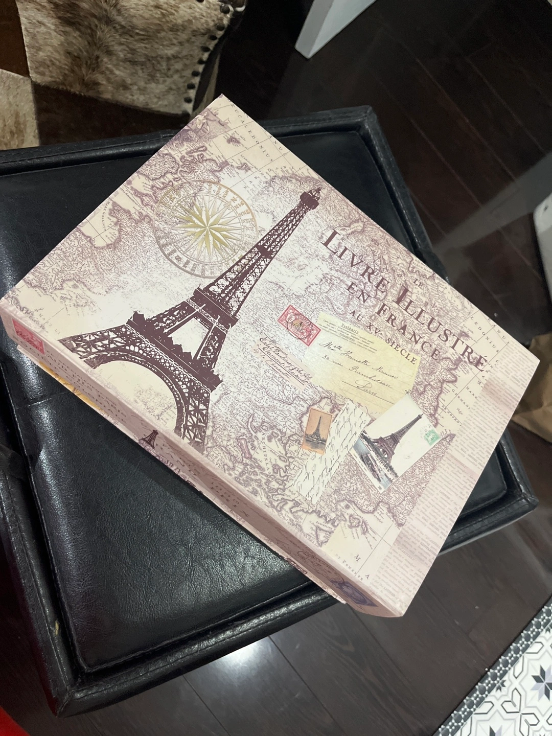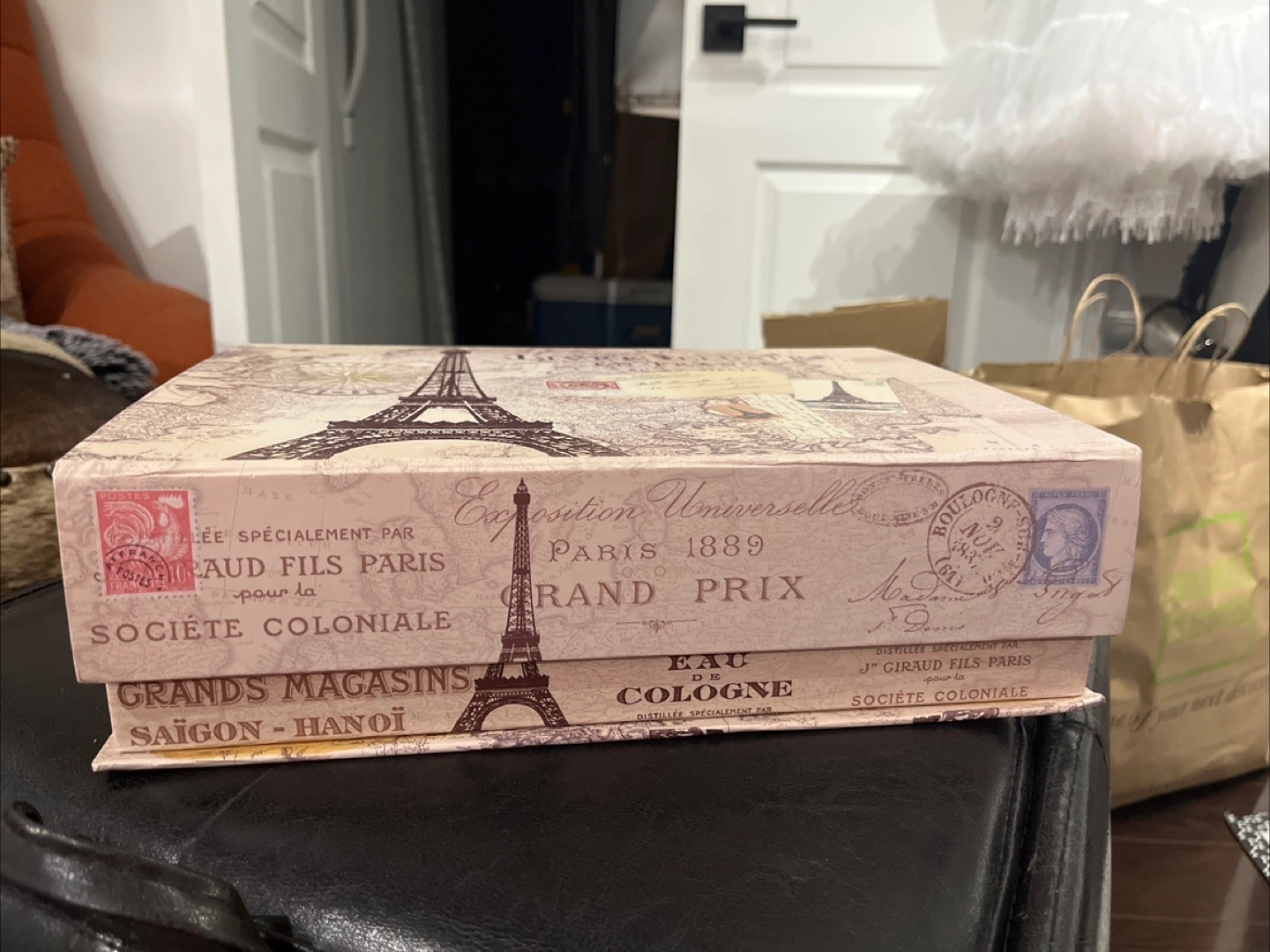 Here's a charming decorative storage box with a Paris theme! It features images of the Eiffel Tower and vintage French script. Perfect for adding a touch of Parisian flair to your home decor while keeping your belongings organized