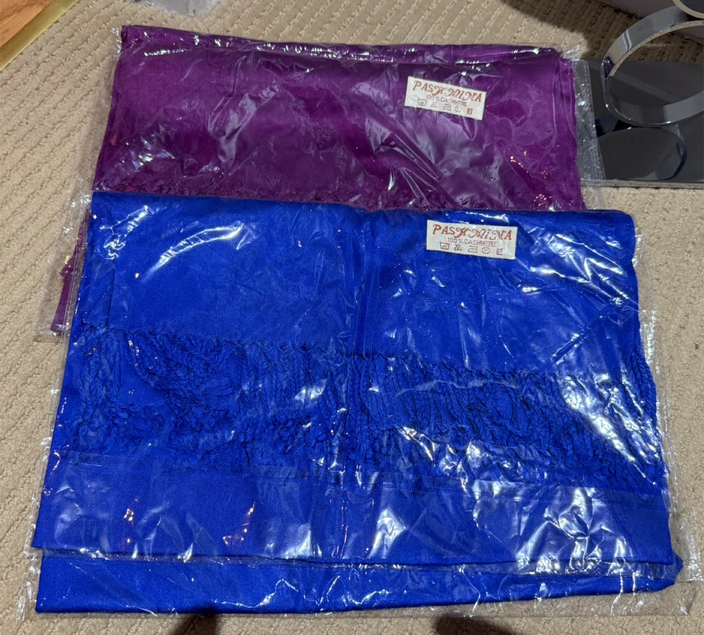 Two beautiful Pashmina scarves, still in their original packaging! One is a vibrant blue and the other is a lovely shade of purple. Both are made of 100% cashmere and feature a fringed edge. Perfect for adding a touch of elegance to any outfit