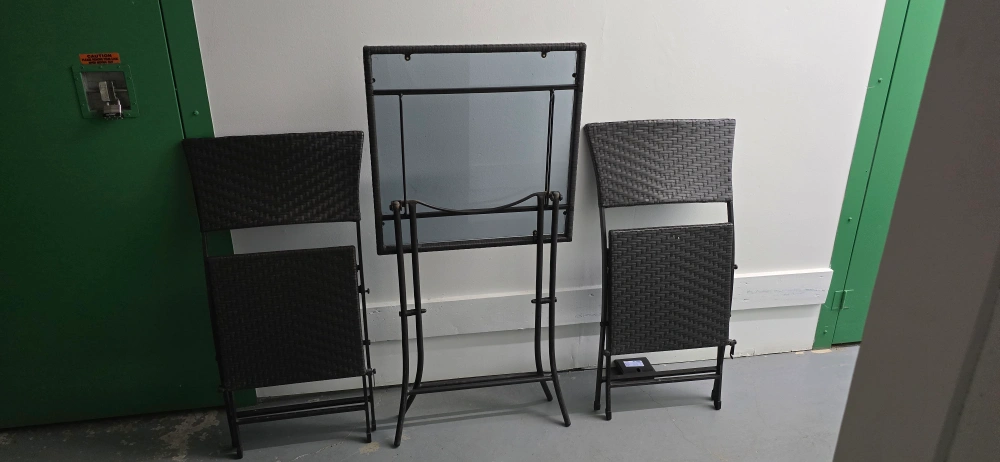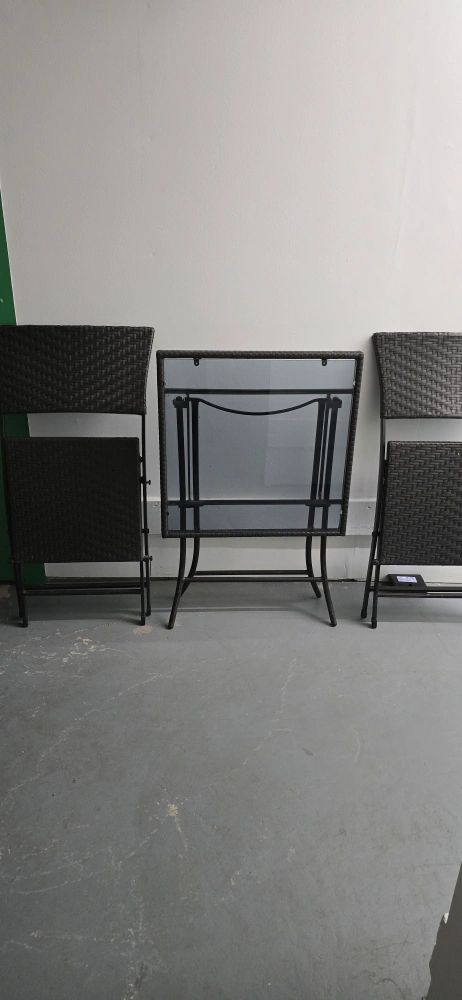 Selling a patio set that includes a small glass-topped table and two matching chairs. The chairs and table have a dark wicker design. Perfect for a small balcony or patio!
