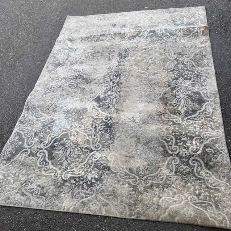 Selling a lovely area rug with a swirling pattern in shades of grey and silver. It's in great condition and would add a touch of elegance to any room!