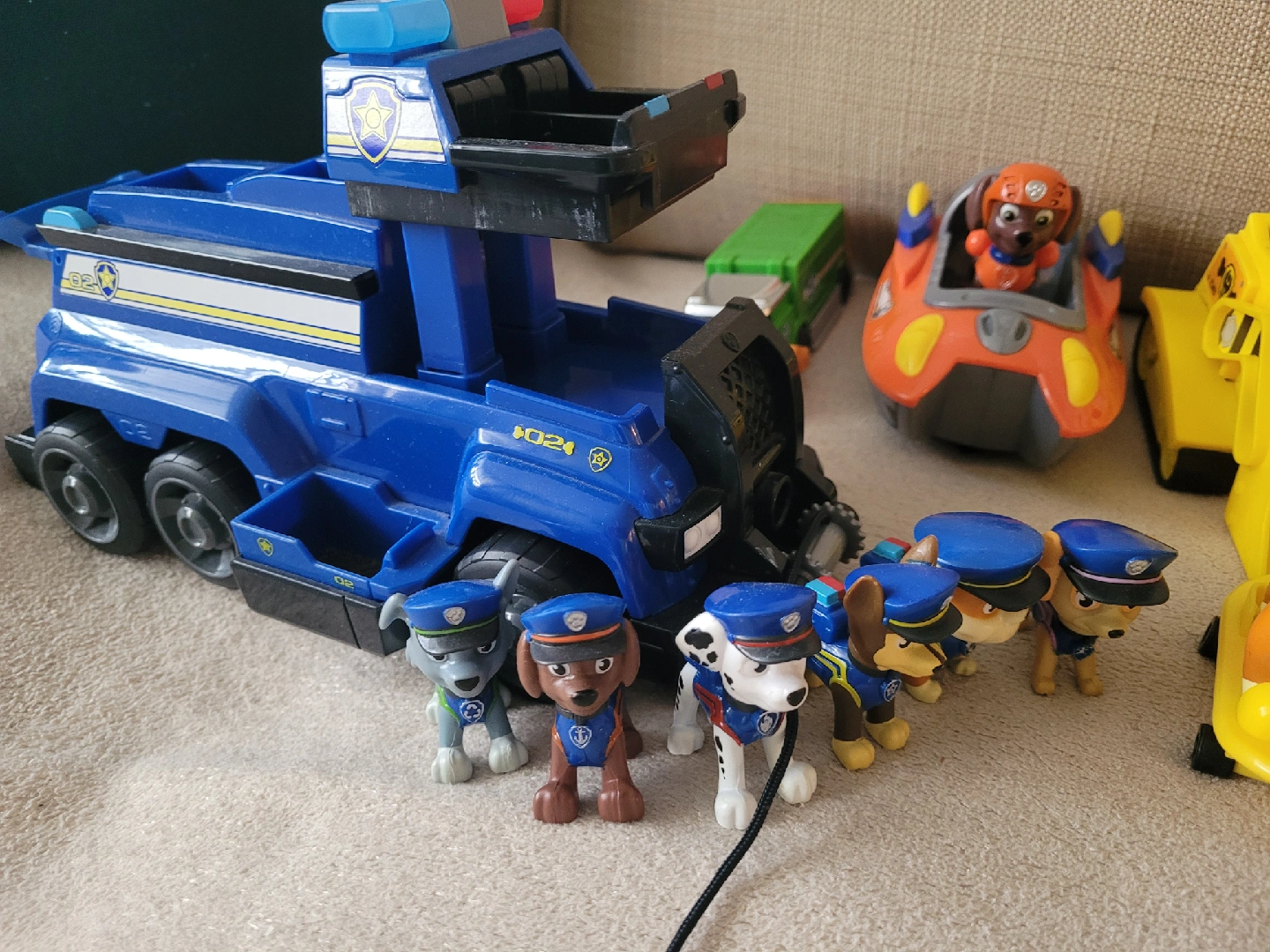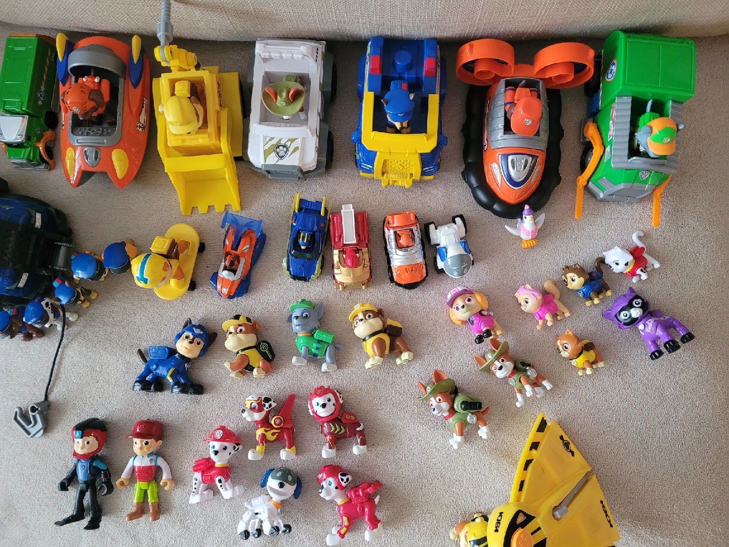Different prices: Dog + vehicles $10 each Rubble with flying tolls $7, Metal car $5each, Chase total team rescue police cruiser, complete set $30, Regular dog $3 each, Robodog $4 Cats $3 each Ryder $8. Pu location Eglinton and Scarlett Etobicoke M9a4m6
