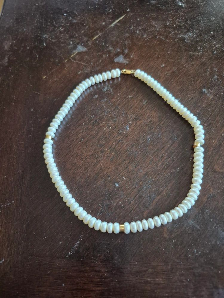Selling a lovely fresh water pearl beaded necklace. with gold deviders. It's a simple and elegant piece that would complement any outfit. The pearls are a creamy white colour and have a nice shine to them. There are also small gold-coloured beads spaced throughout the necklace.